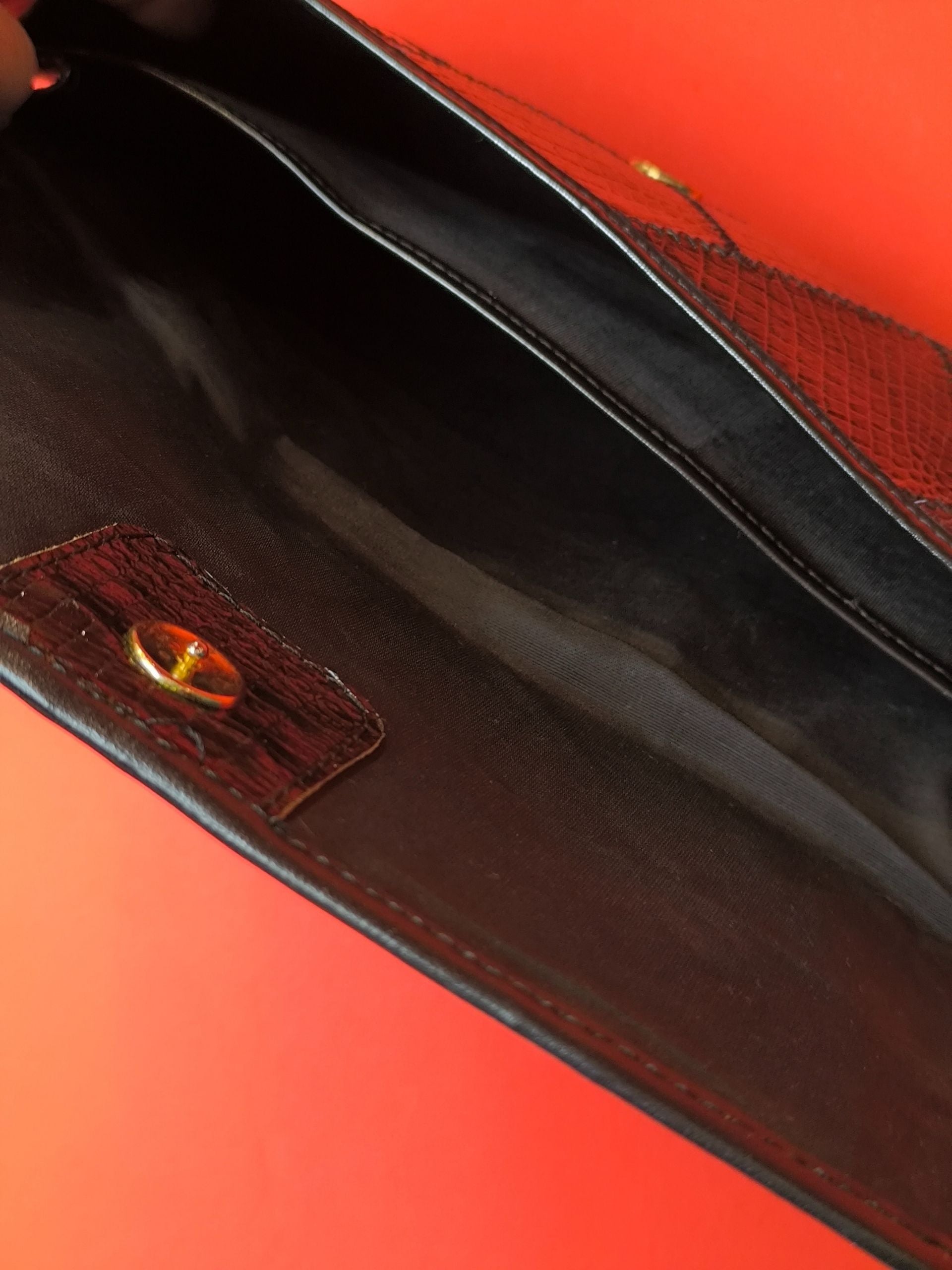 Vintage μαύρη δερμάτινη τσάντα ώμου με υφή snakeskin, χρυσή αλυσίδα, μαγνητικό κούμπωμα και εσωτερική τσέπη. Μικρό σημαδάκι σε μία γωνία (βλ. τελευταία φωτογραφία).