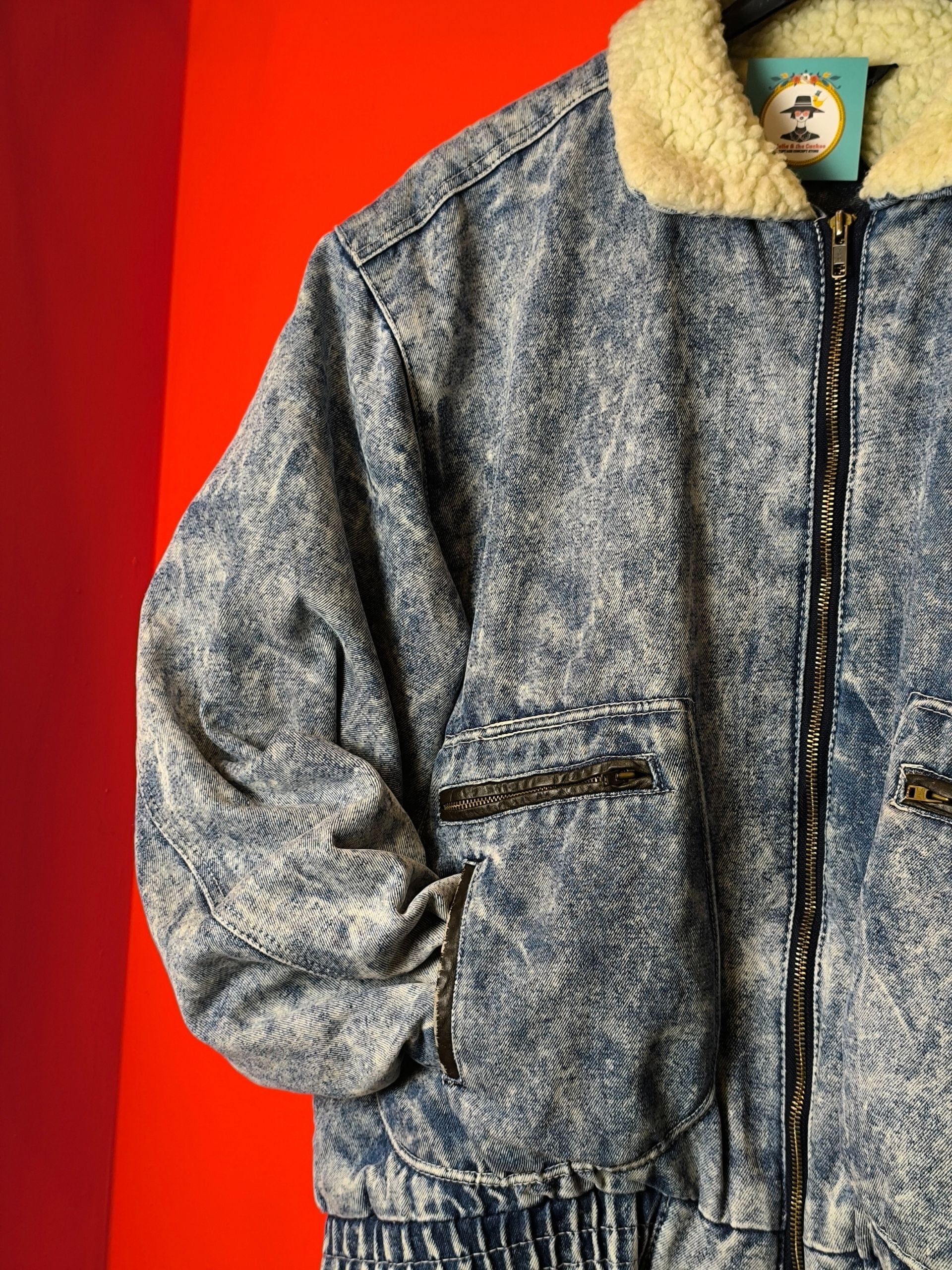 Vintage acid-wash denim bomber jacket from the late 80s–early 90s, featuring a warm sherpa lining and a soft faux-shearling collar. Its classic bomber silhouette, elasticated hem and oversized drop-shoulder fit give it the authentic street look of the era. The acid-wash texture and zippered pockets add a bold retro feel, making it a standout winter statement piece in very good vintage condition.