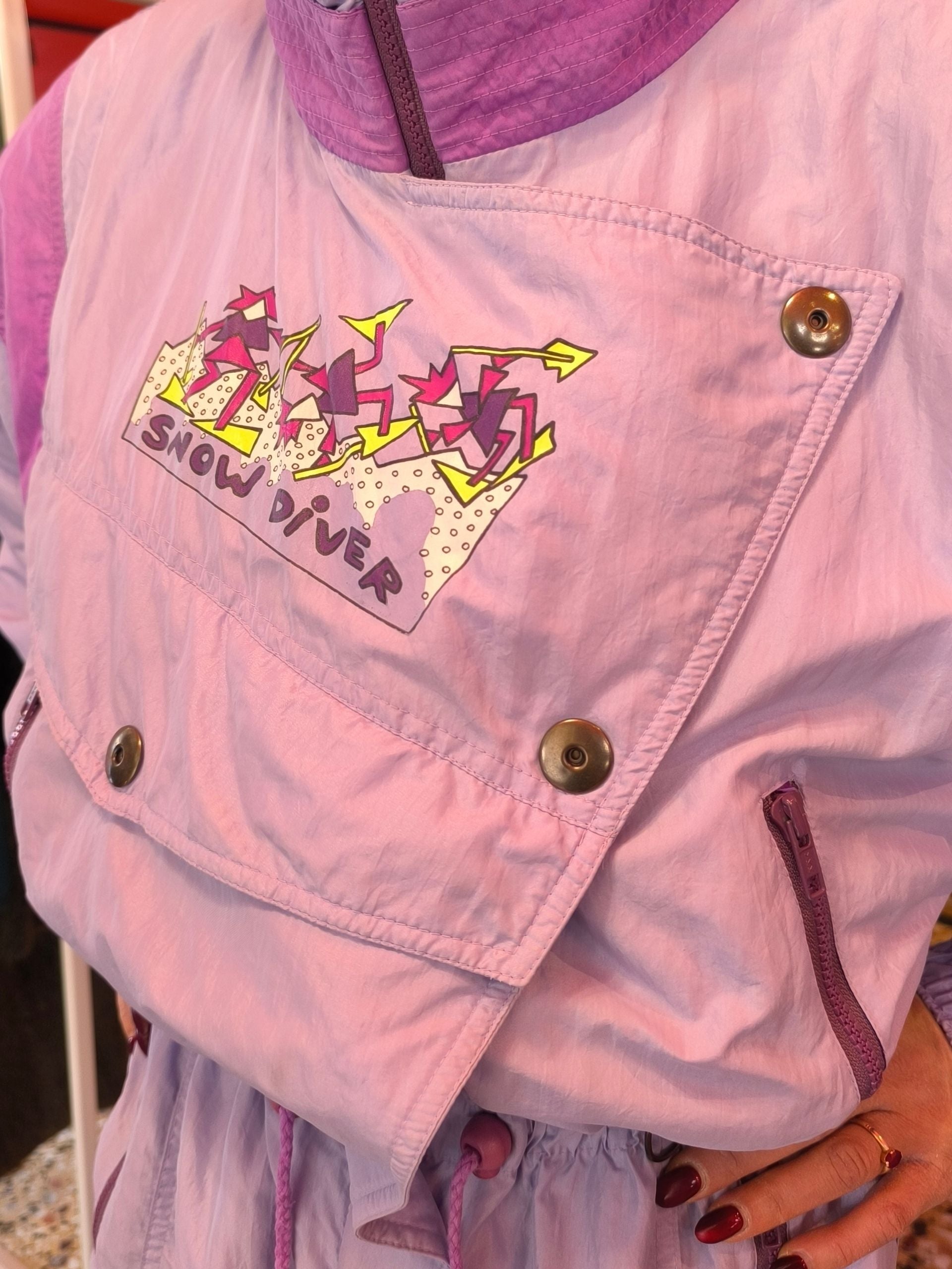Vintage γυναικεία στολή ski & snowboard από τη Golden Team “Silver Wings”, σε dreamy λιλά και μοβ αποχρώσεις που φωνάζουν 80s–90s alpine αισθητική. Ένα statement one-piece με έντονα graphic στοιχεία, oversized σιλουέτα και αυθεντικό retro χαρακτήρα — ιδανικό τόσο για βουνό όσο και για après-ski εμφανίσεις.