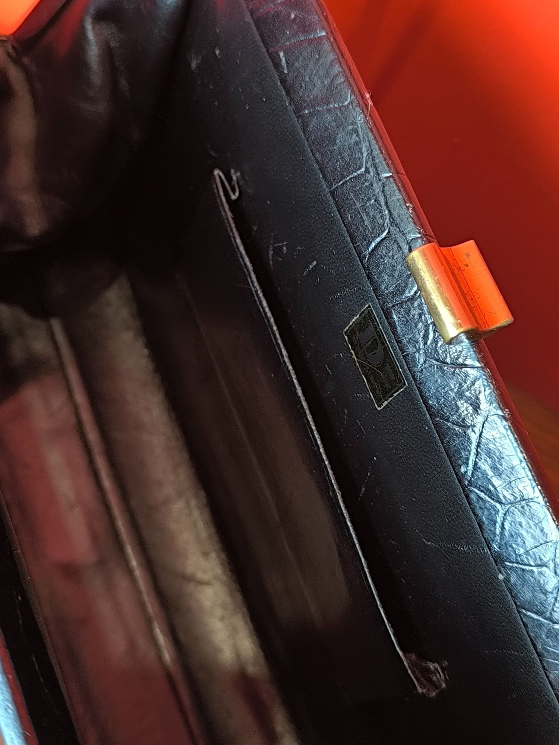 Κομψή vintage τσάντα D Exklusiv δεκαετίας 1960, κατασκευασμένη από γνήσιο δέρμα κροκό σε μαύρη γυαλιστερή απόχρωση. Διαθέτει διπλό χερούλι, εσωτερικό τσεπάκι, μεταλλικό κούμπωμα σε χρυσό τόνο και μεταλλικά ποδαράκια στη βάση για προστασία. Ένα εκλεπτυσμένο και διαχρονικό κομμάτι της mid-century εποχής.