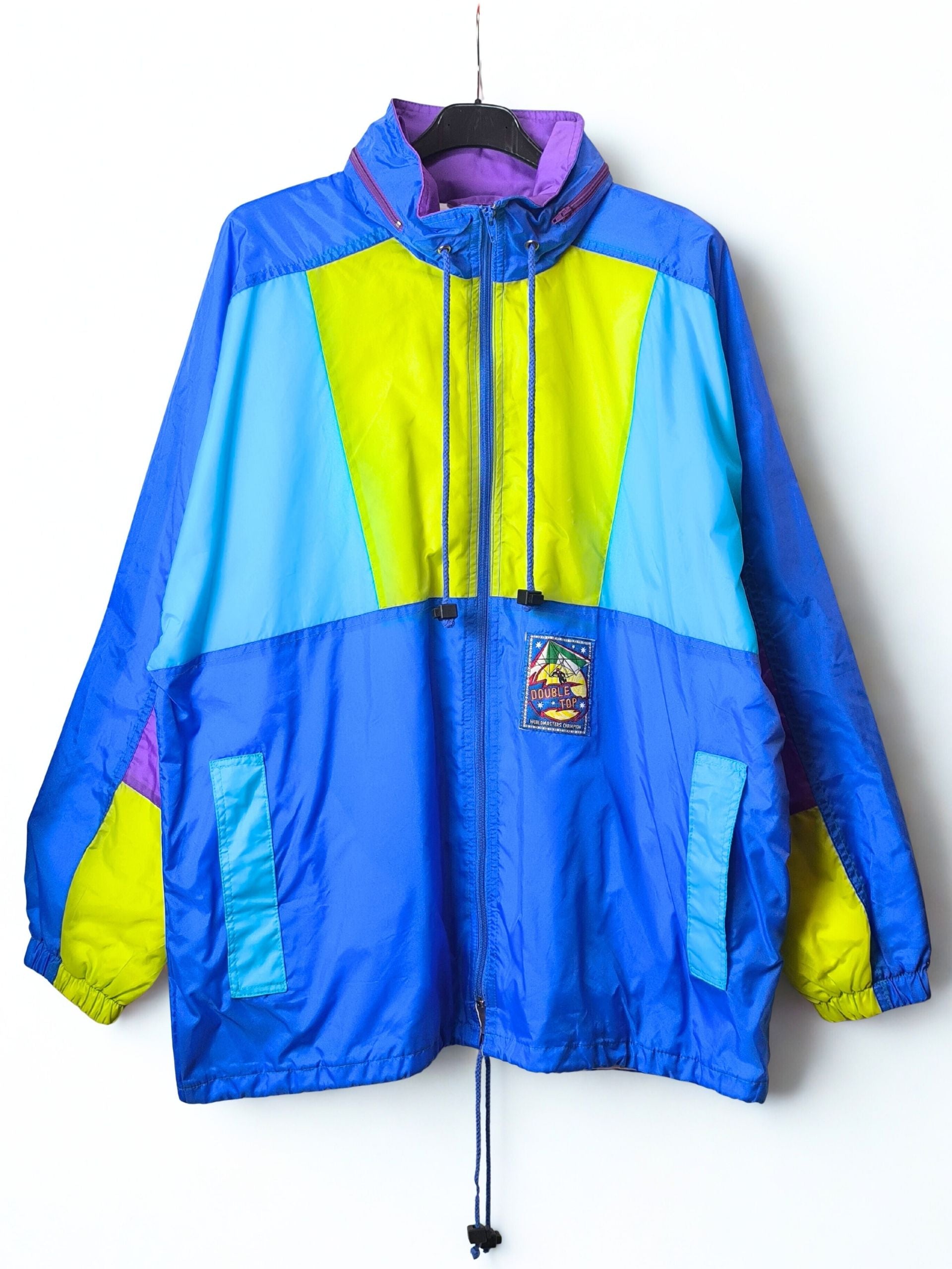 An eye-catching 90s windbreaker by Marcel Clair in a bold unisex colorblock design featuring vibrant blue, neon yellow, turquoise, and purple panels. The large front badge reading “Double Top – Worldmasters Champion” adds a sporty, adrenaline-fueled vibe. Made from lightweight water-repellent fabric with a hidden hood and cotton lining, it's perfect for outdoor adventures or rave-ready streetwear.