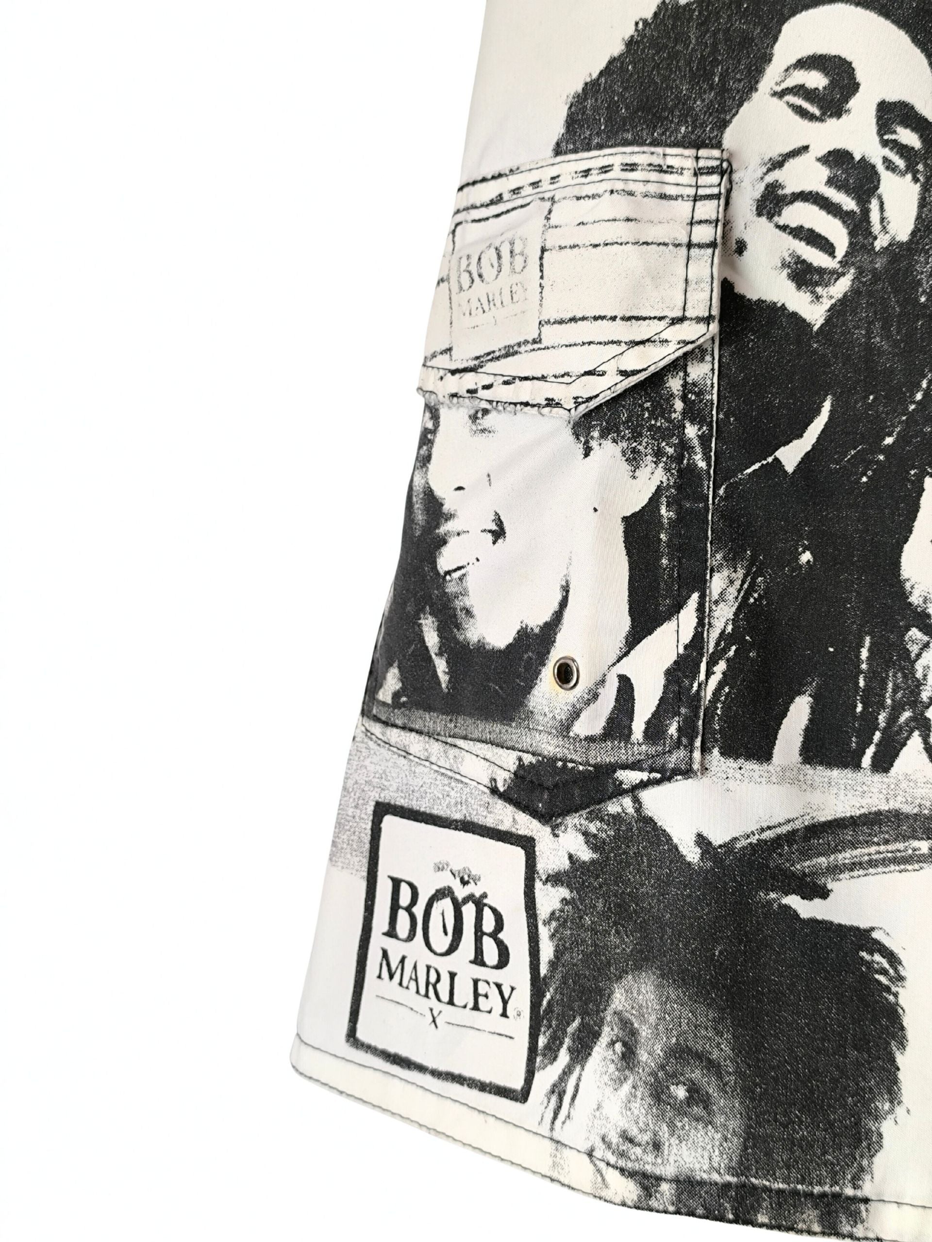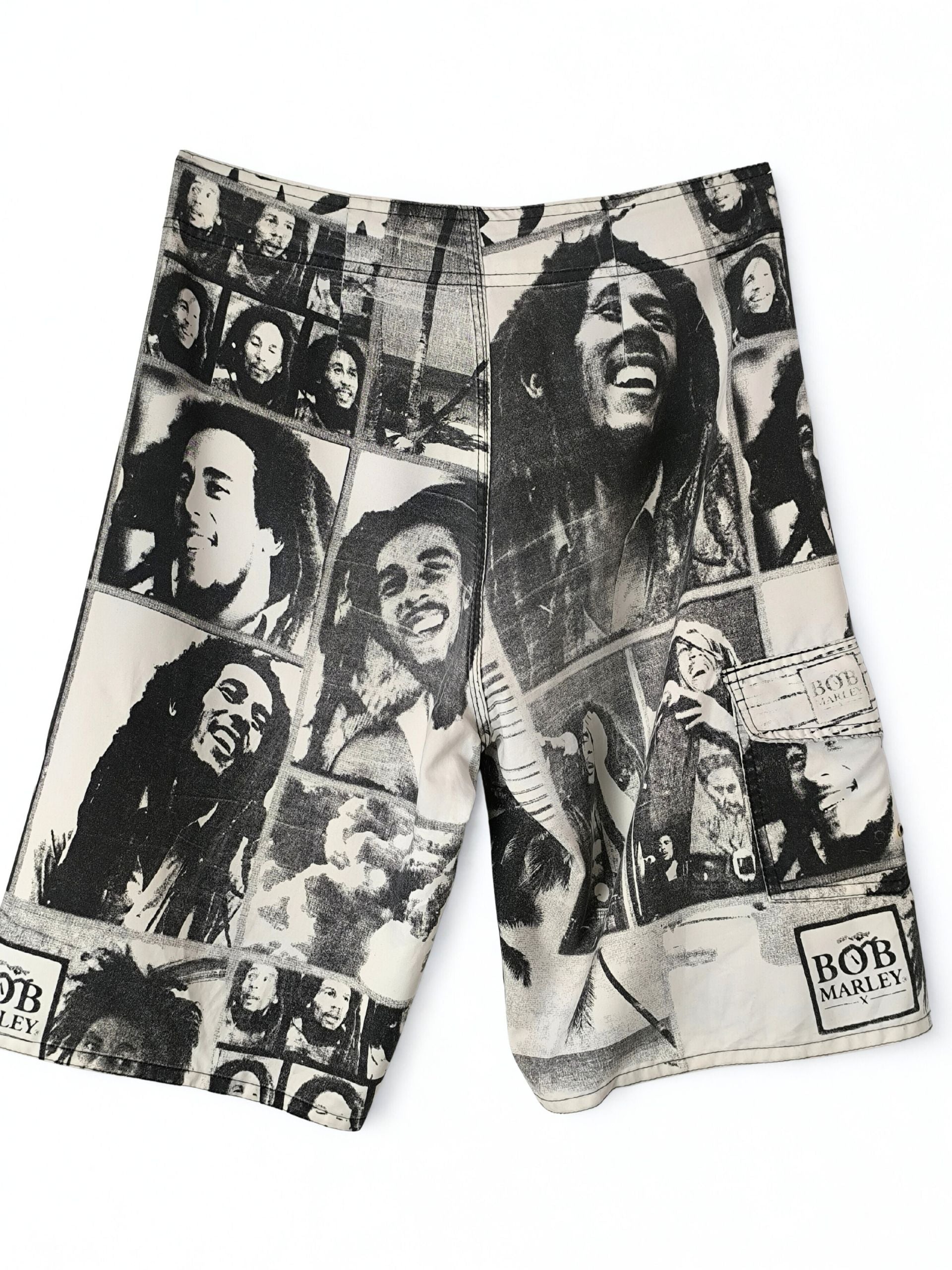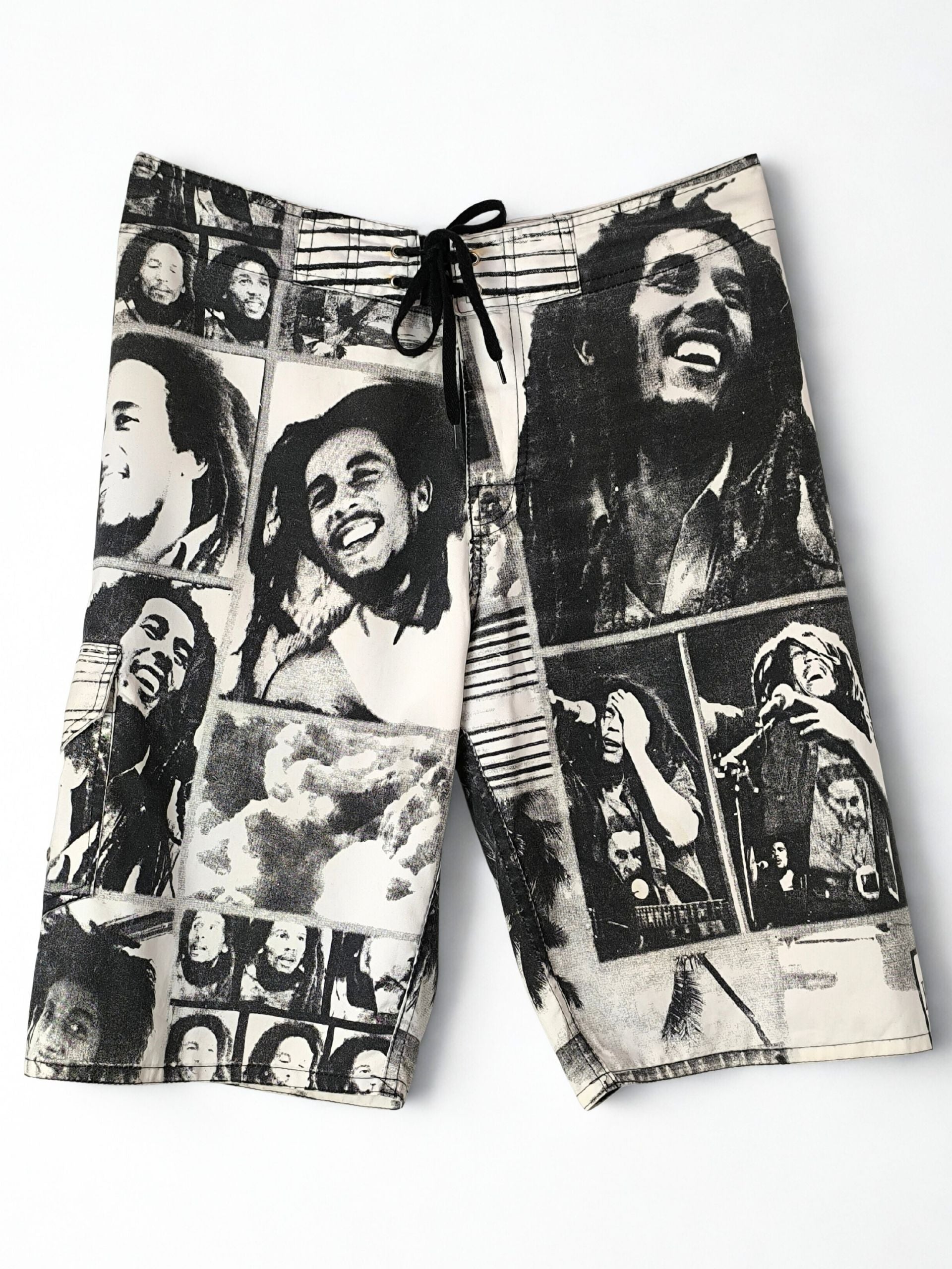 Channel iconic reggae energy with these black-and-white Bob Marley board shorts. Featuring an all-over collage of vintage-style portraits and live performance shots, this piece blends bold graphics with laid-back beach vibes.
