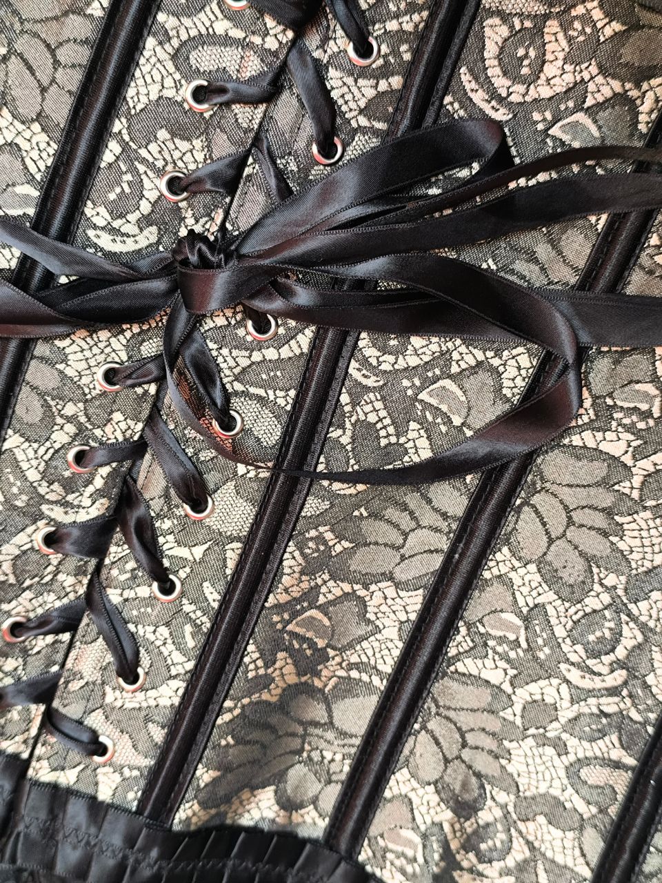 Plus Size Beige Black Brocade Overbust Corset with Adjustable Ribbon. Metal Hook and eye front closure.