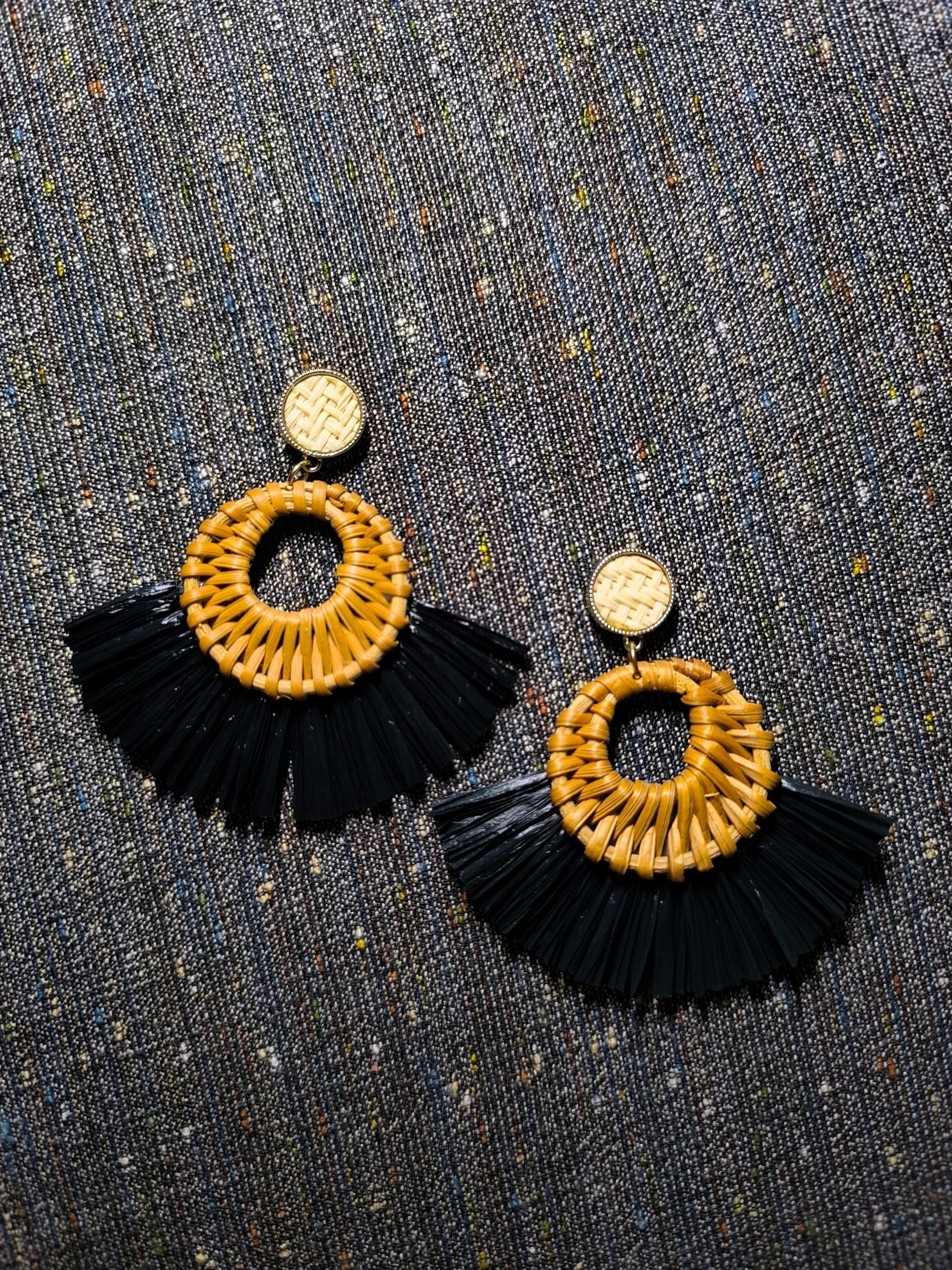 Bold and bohemian, these statement earrings blend natural textures with dramatic flair. Featuring a round rattan-style stud with woven detail, each earring drops into a circular wicker hoop adorned with sleek black raffia fringes. Lightweight yet eye-catching, they're perfect for warm-weather looks or adding earthy elegance to eveningwear.