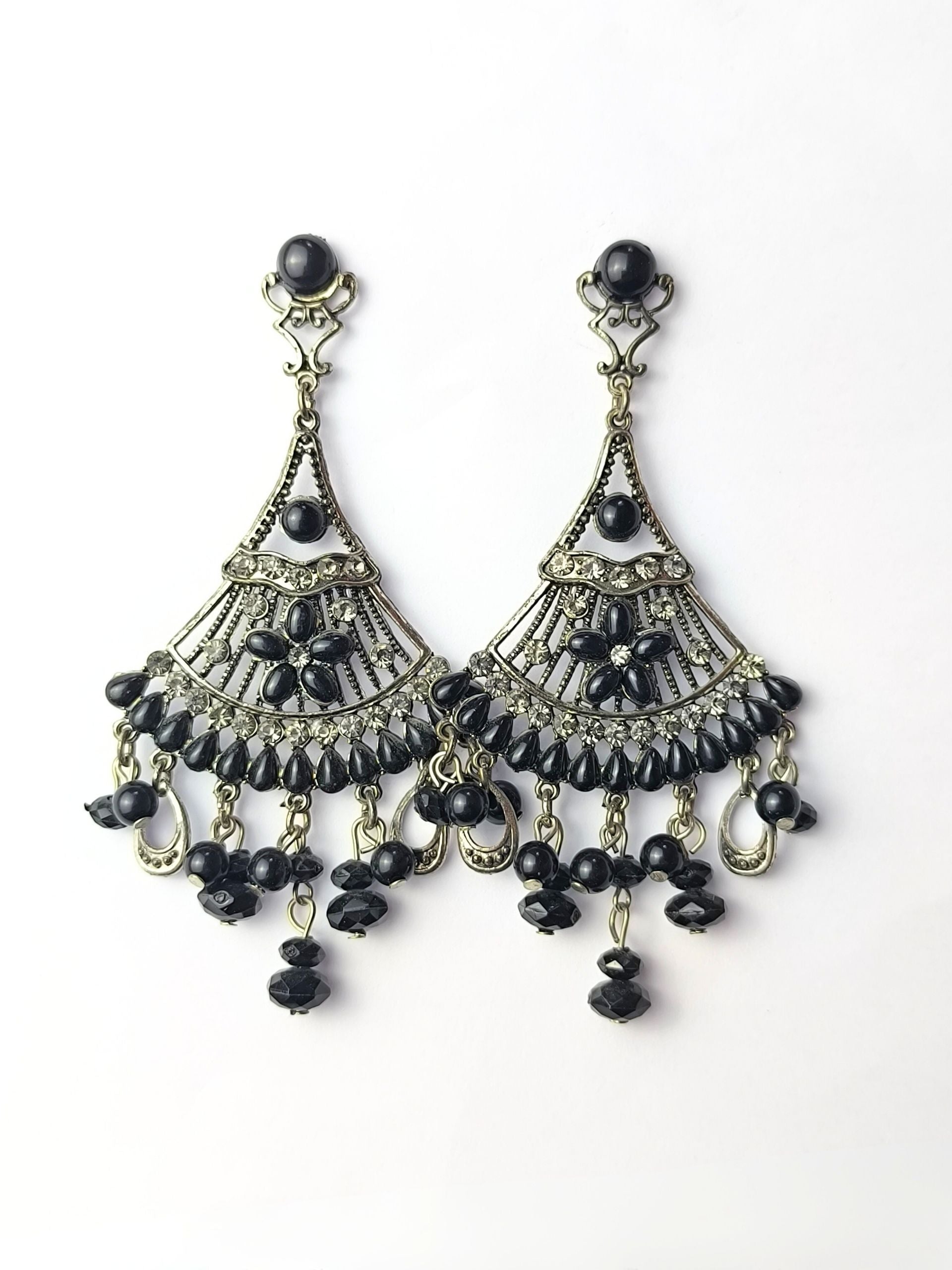 These striking deadstock chandelier earrings by Duki Daso feature an ornate fan-shaped filigree design in antique silver tone. Adorned with glossy black beads, faceted faux crystals, and delicate floral motifs, they channel a dramatic gothic-glam aesthetic. With tiered dangles that sway elegantly, they make the perfect bold statement piece.