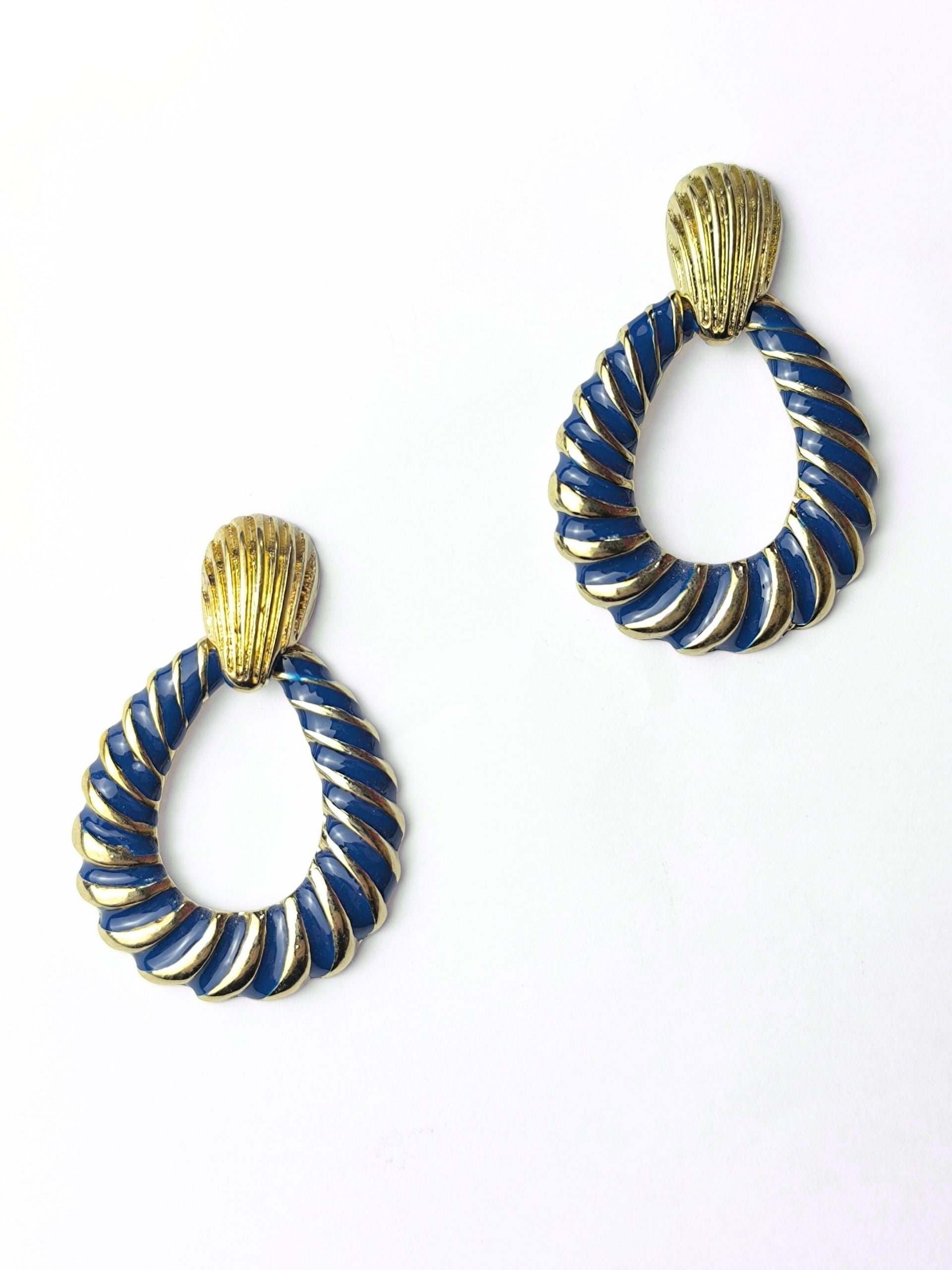 Striking deadstock earrings by Duki Daso, inspired by the bold, glamorous style of the 1980s. Featuring a gold-tone shell-shaped top and a twisted teardrop hoop with deep navy enamel and gold accents, these earrings blend vintage flair with timeless elegance.