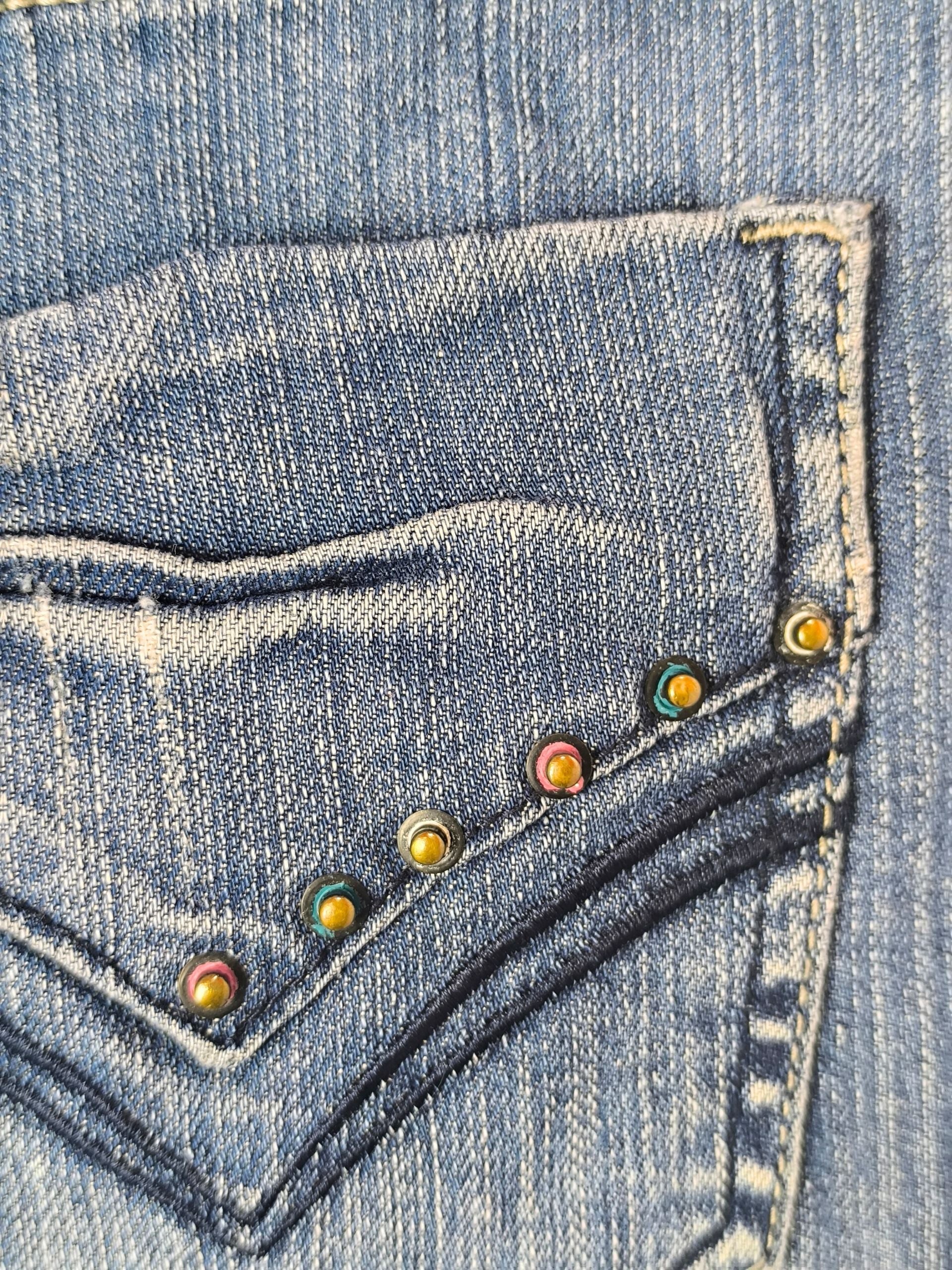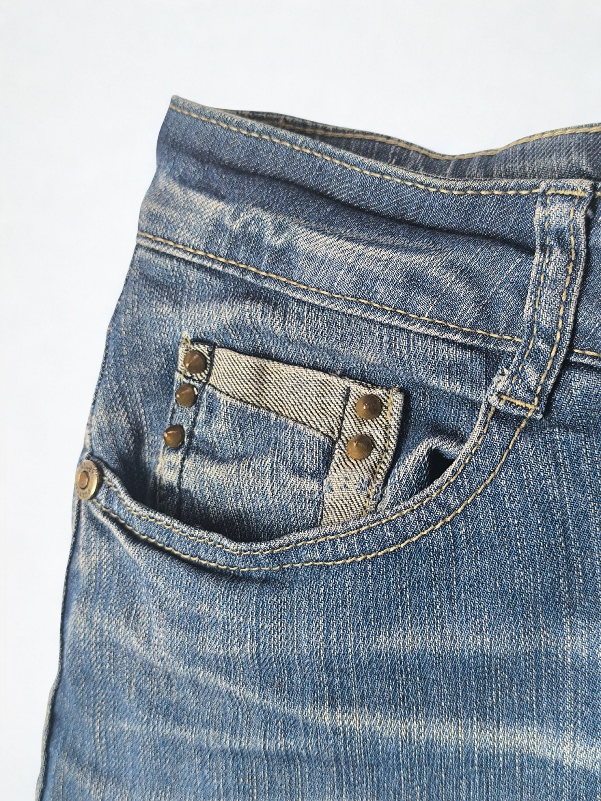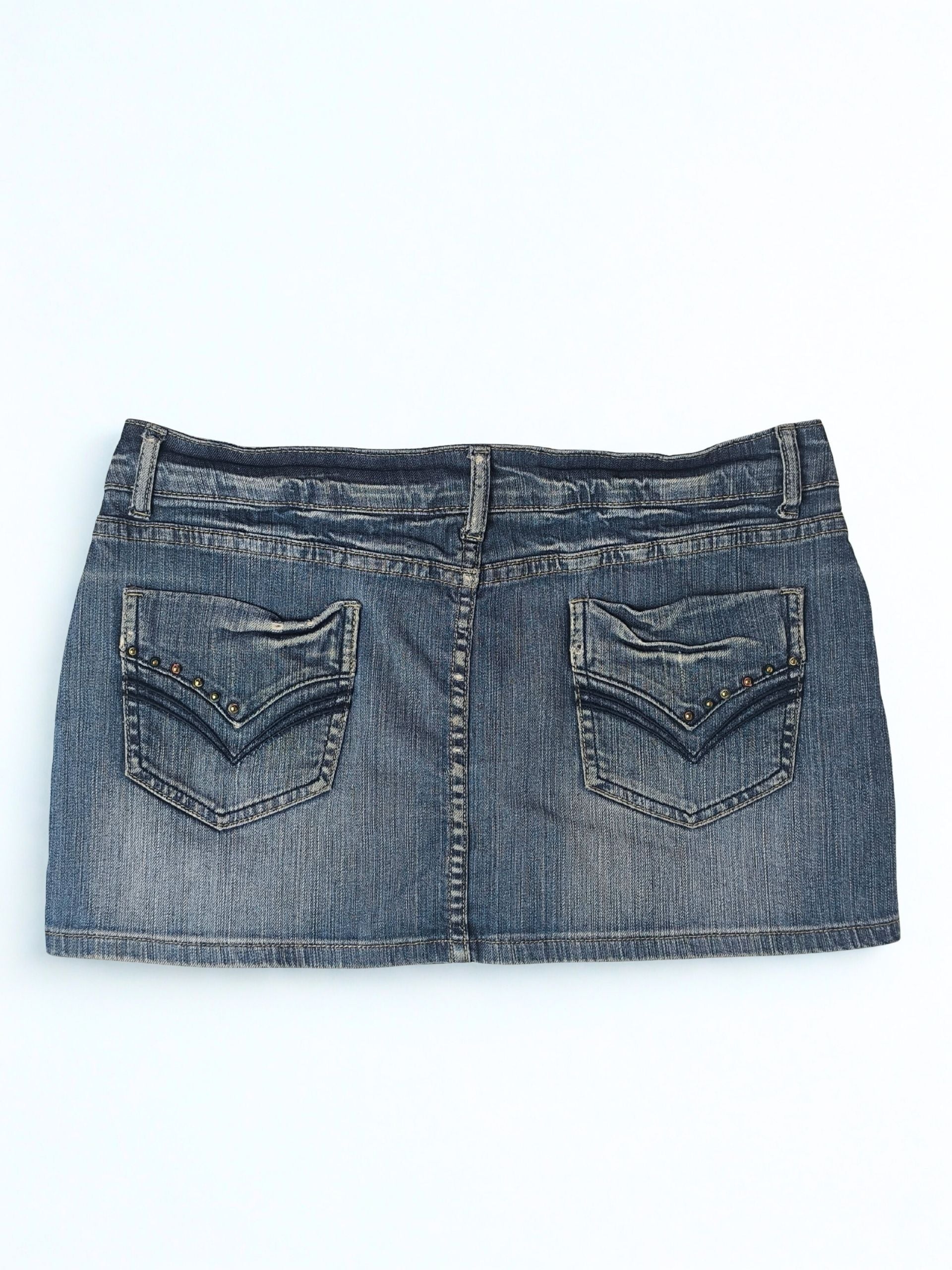 Low-rise denim mini skirt by Mild Point, featuring signature fading, contrast stitching, and metal rivets. The back pockets have a distinctive V shape with colorful studs, adding to its 2000s charm.