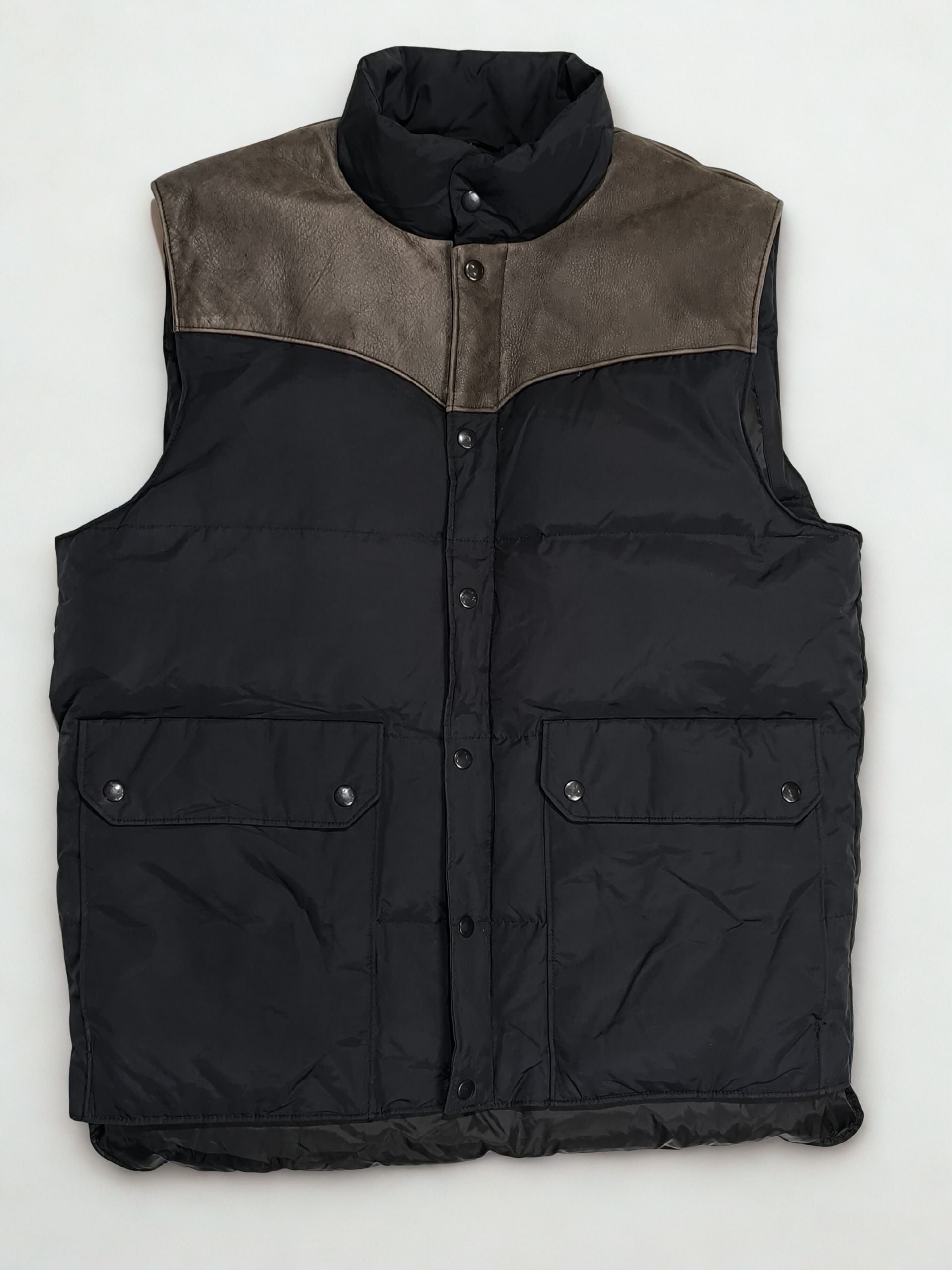 Vintage Mercedes-Benz padded gilet with premium construction and a refined, minimal luxury feel. Matte black padded body combined with genuine leather panels on the shoulders and chest, while the down filling provides excellent warmth without bulk. A vintage piece from the late ’90s–early ’00s era with authentic automotive heritage aesthetics, perfect for collectors and modern statement layering.