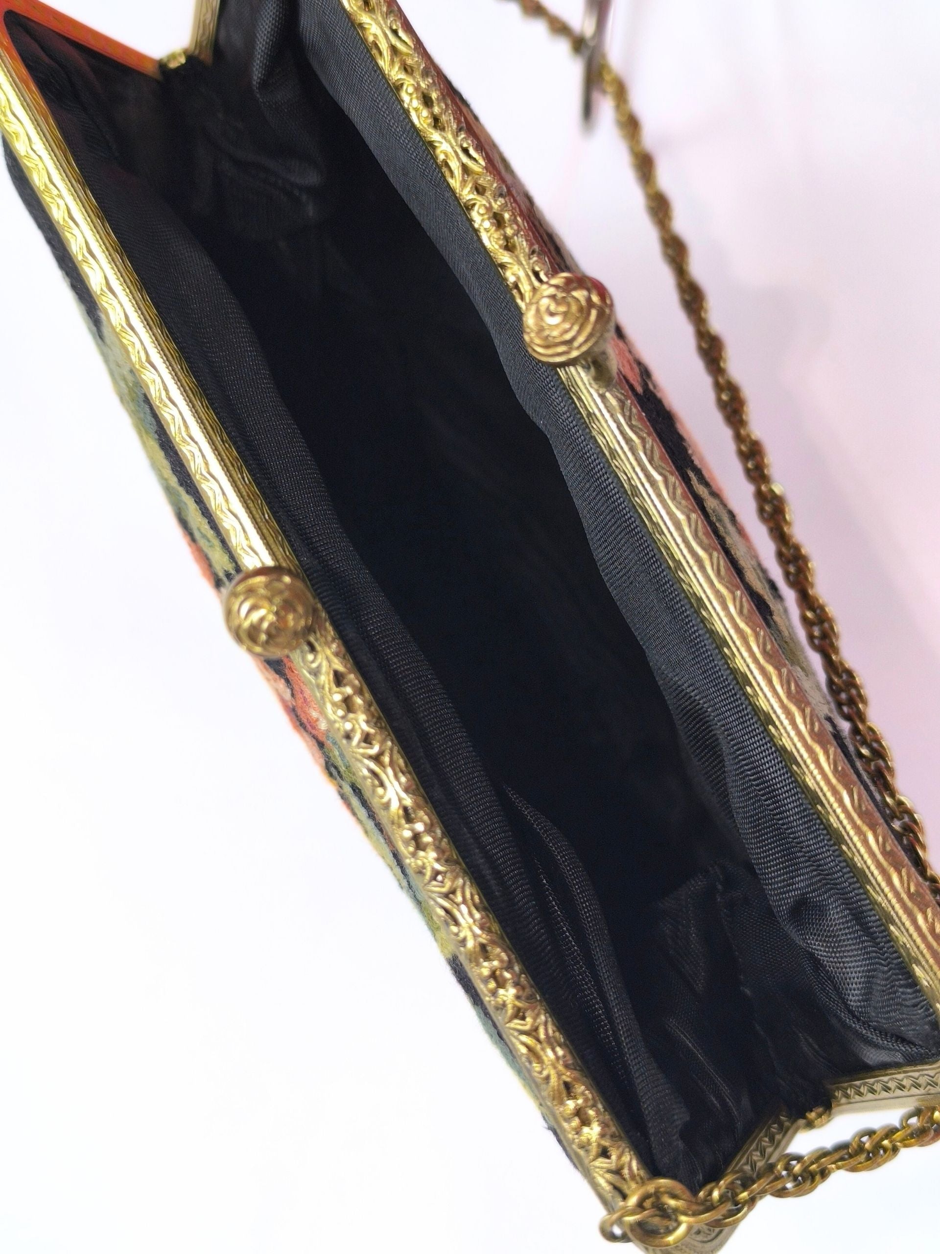 A beautiful mid-century embroidered evening bag featuring a romantic floral motif on a black canvas. This vintage treasure showcases intricate needlework and a rich color palette of warm pinks, yellows, and greens. It is framed with an ornate brass-tone kiss-lock clasp and a finely detailed metal chain handle. The interior is lined in black fabric and includes a small inner pocket — ideal for your essentials during a special evening out.