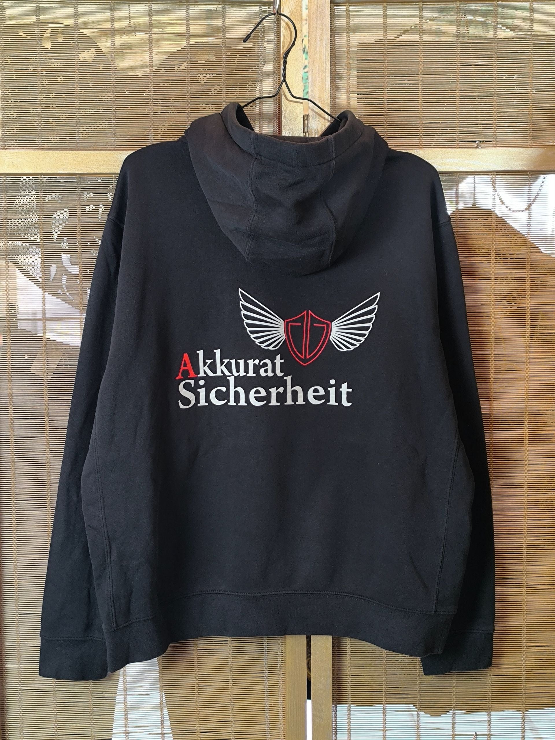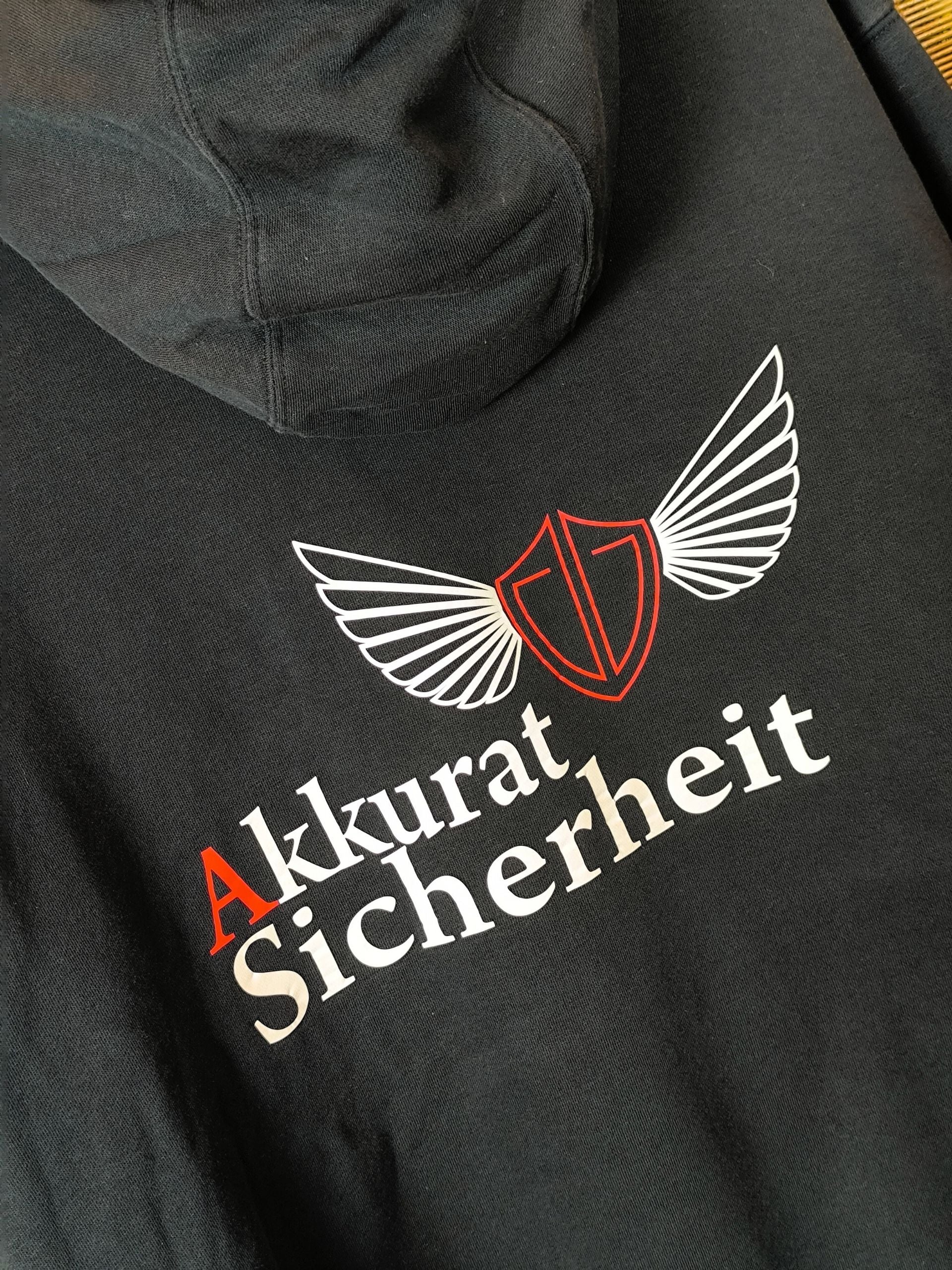 Large sponsor print: Akkurat Sicherheit with shield + wings logo (back)