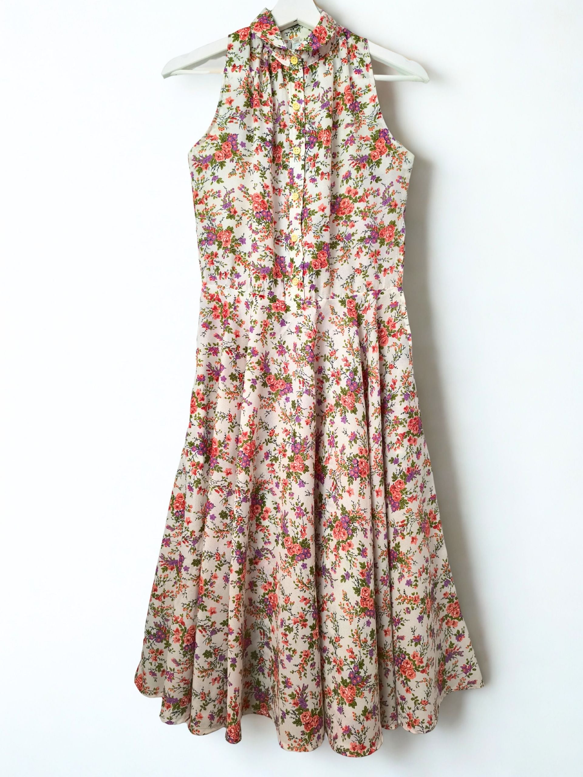 Sleeveless Floral Midi Dress – 1970s Style with Gathered Neckline & Button Detail