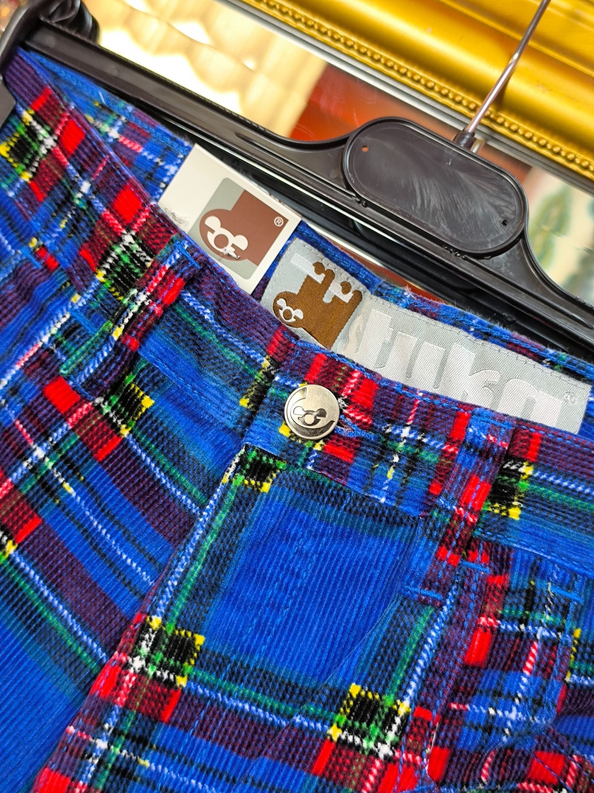 Authentic Stuka streetwear cargo pants from the late 90s – early 2000s, made from bold blue-red tartan corduroy. These trousers embody pure skate & street style, with a wide-leg silhouette reminiscent of JNCO-style aesthetics.