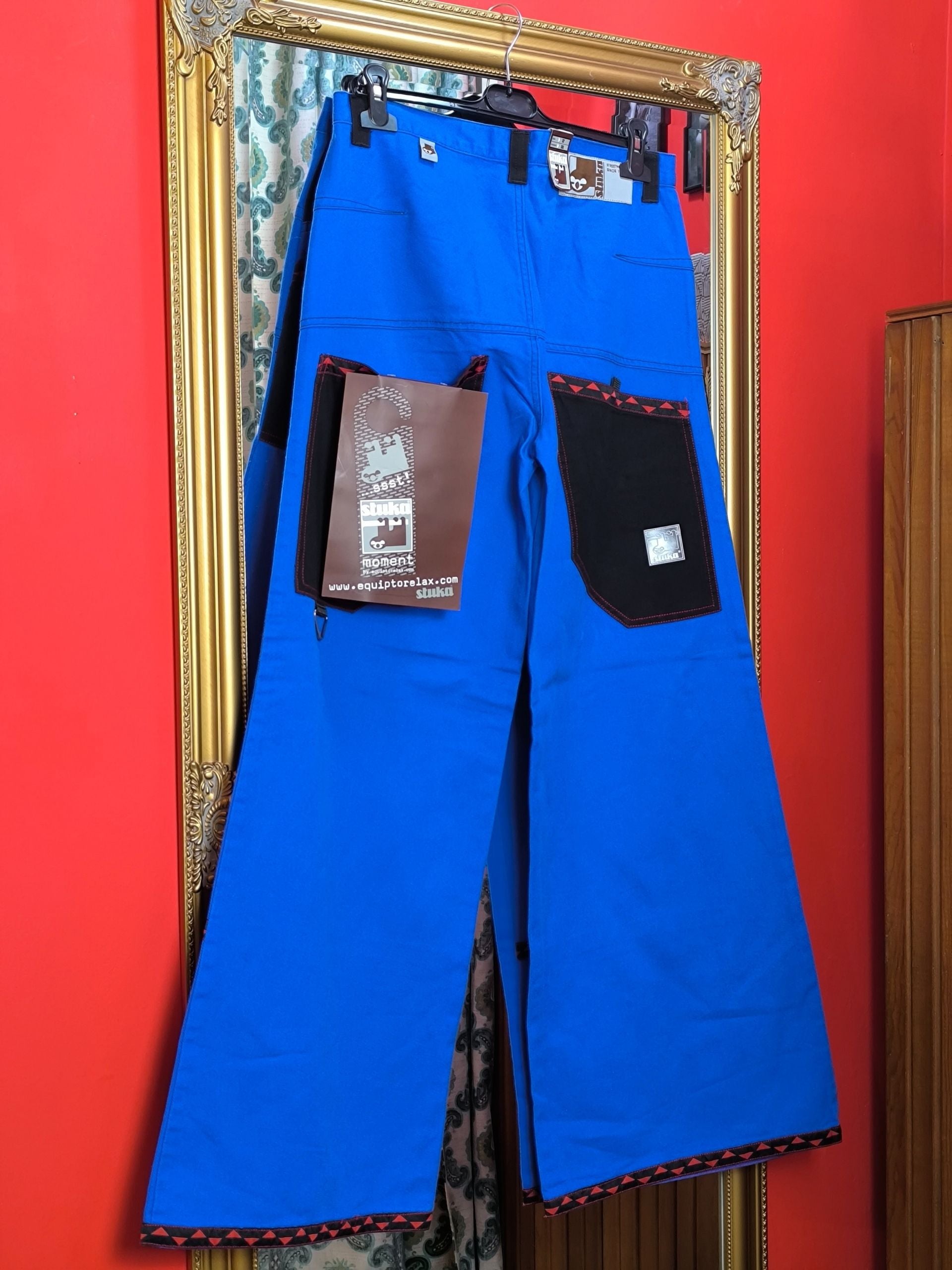 Εντυπωσιακό παντελόνι εργασιακού στυλ σε έντονο μπλε κοβαλτί από τη Stuka, χαρακτηριστικό της skate & streetwear αισθητικής των 90s–early 2000s. Κατασκευασμένο από ανθεκτικό 100% βαμβακερό twill, με μαύρες τσέπες και κόκκινη γεωμετρική τρέσα, προσφέρει το αυθεντικό φαρδύ, χαλαρό look εκείνης της εποχής. Αυθεντικό deadstock κομμάτι με όλες τις ετικέτες του.