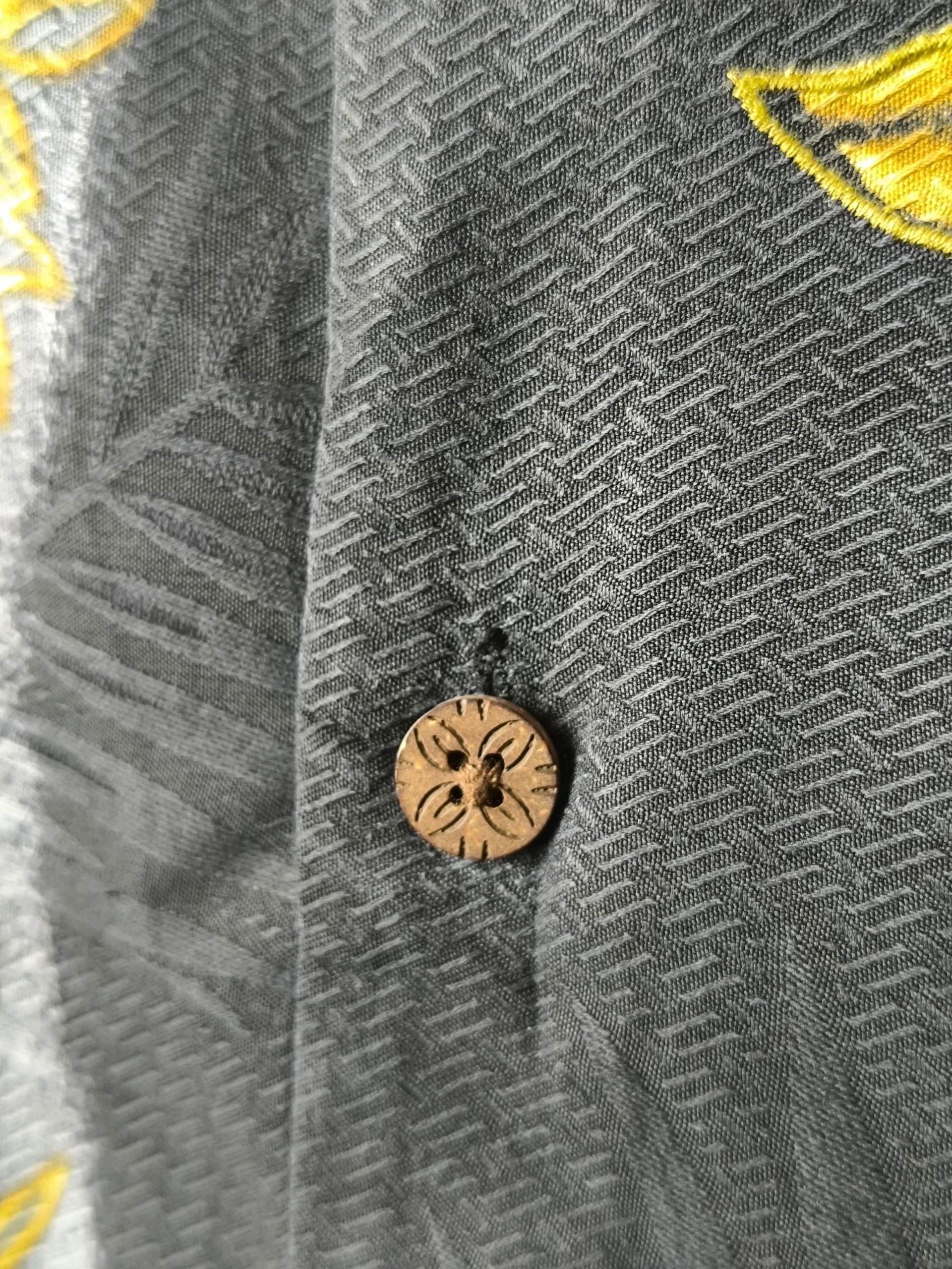 Elevate your resortwear game with this luxurious shirt by Tommy Bahama, a renowned American brand celebrated for its laid-back island aesthetic. Crafted from 100% silk, it features a rich charcoal base adorned with golden floral and tropical leaf motifs. The textured jacquard weave and signature coconut shell buttons with a sand dollar design add a distinctive touch. A timeless piece for summer holidays, coastal evenings, or effortless everyday elegance.