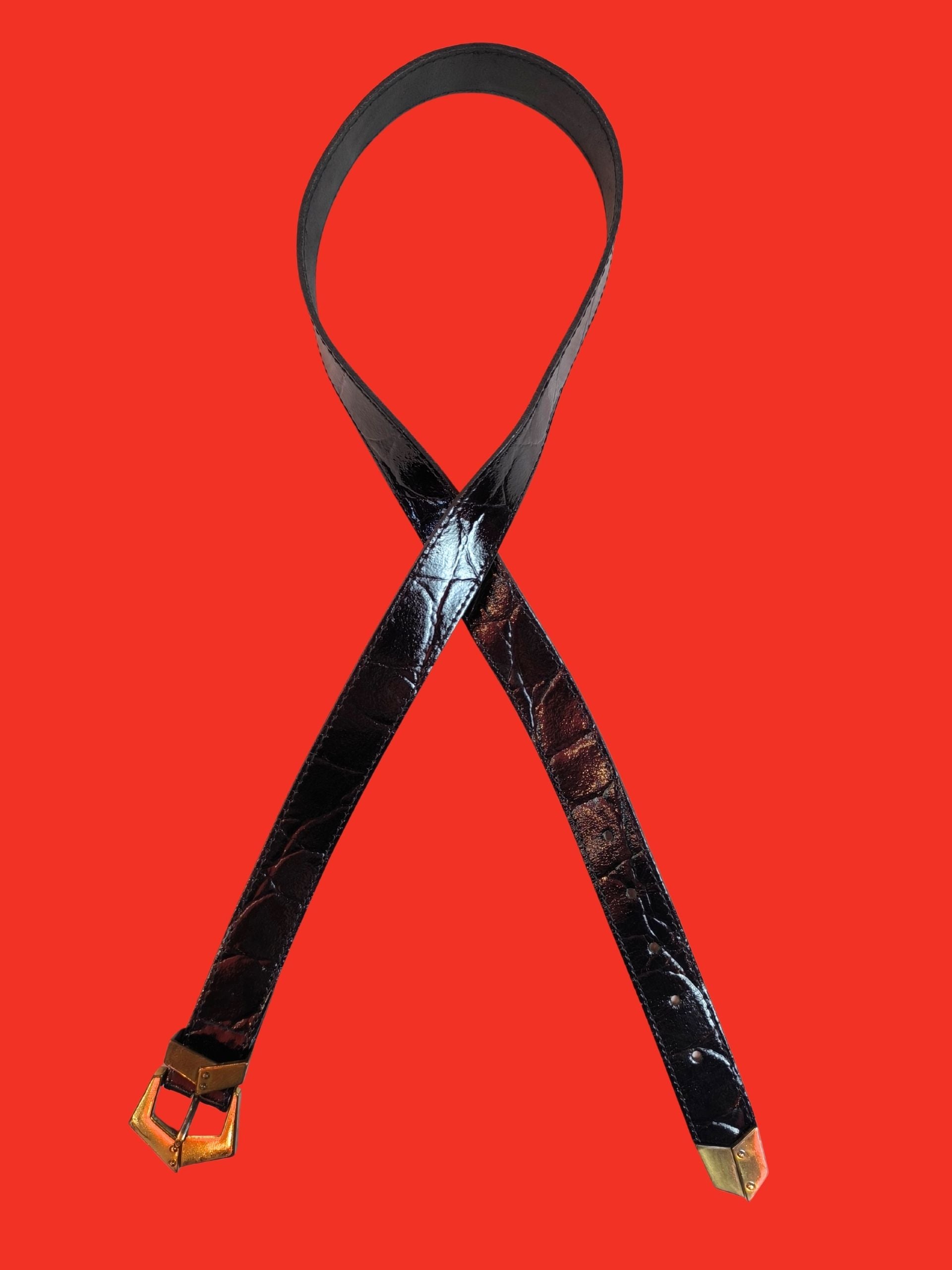 Striking vintage belt by Sunbelt®, made of genuine embossed black leather with a glossy finish. The standout geometric brass-tone buckle and tip give it a strong 1980s–90s edge, ideal for bold styling.