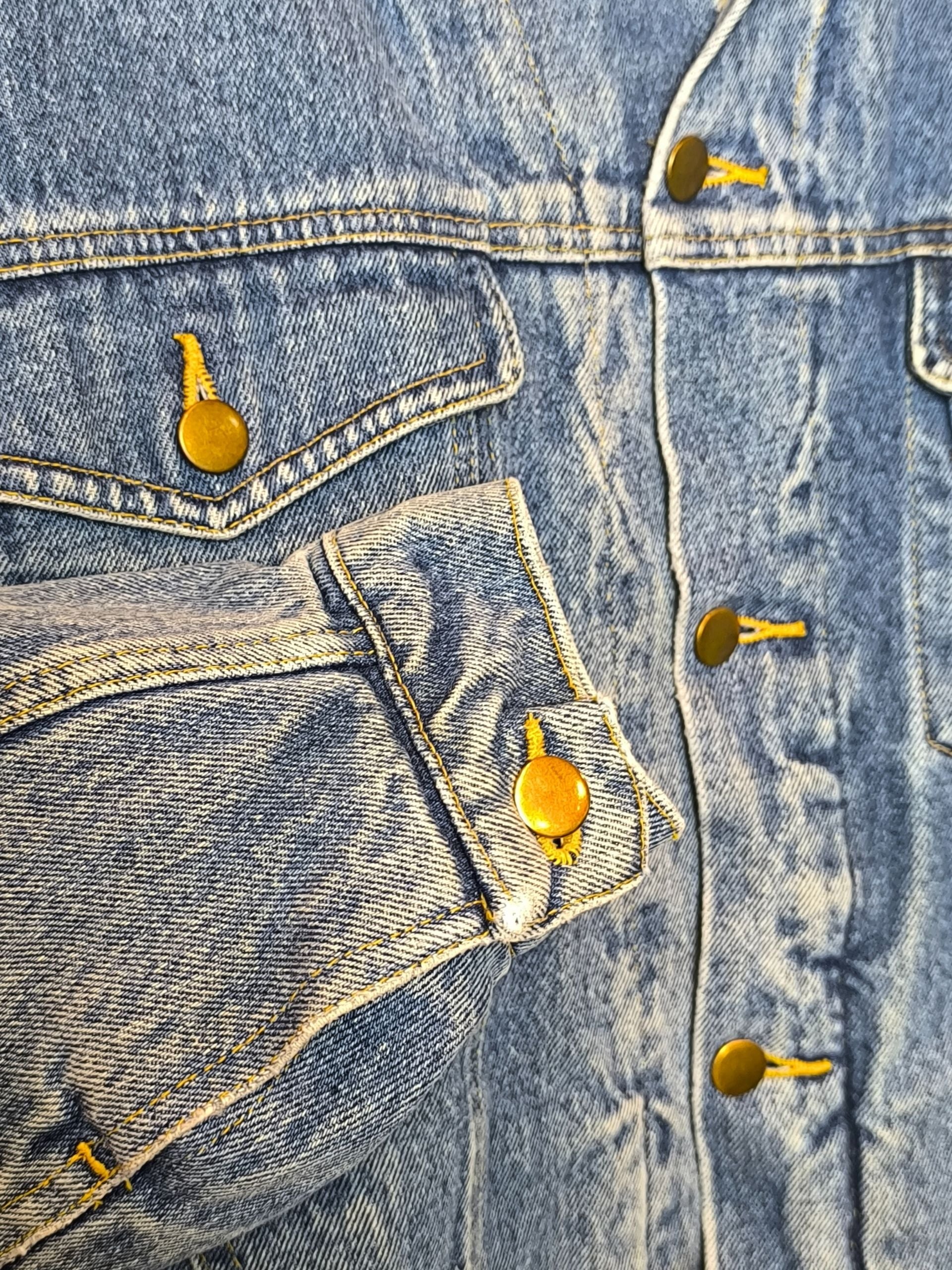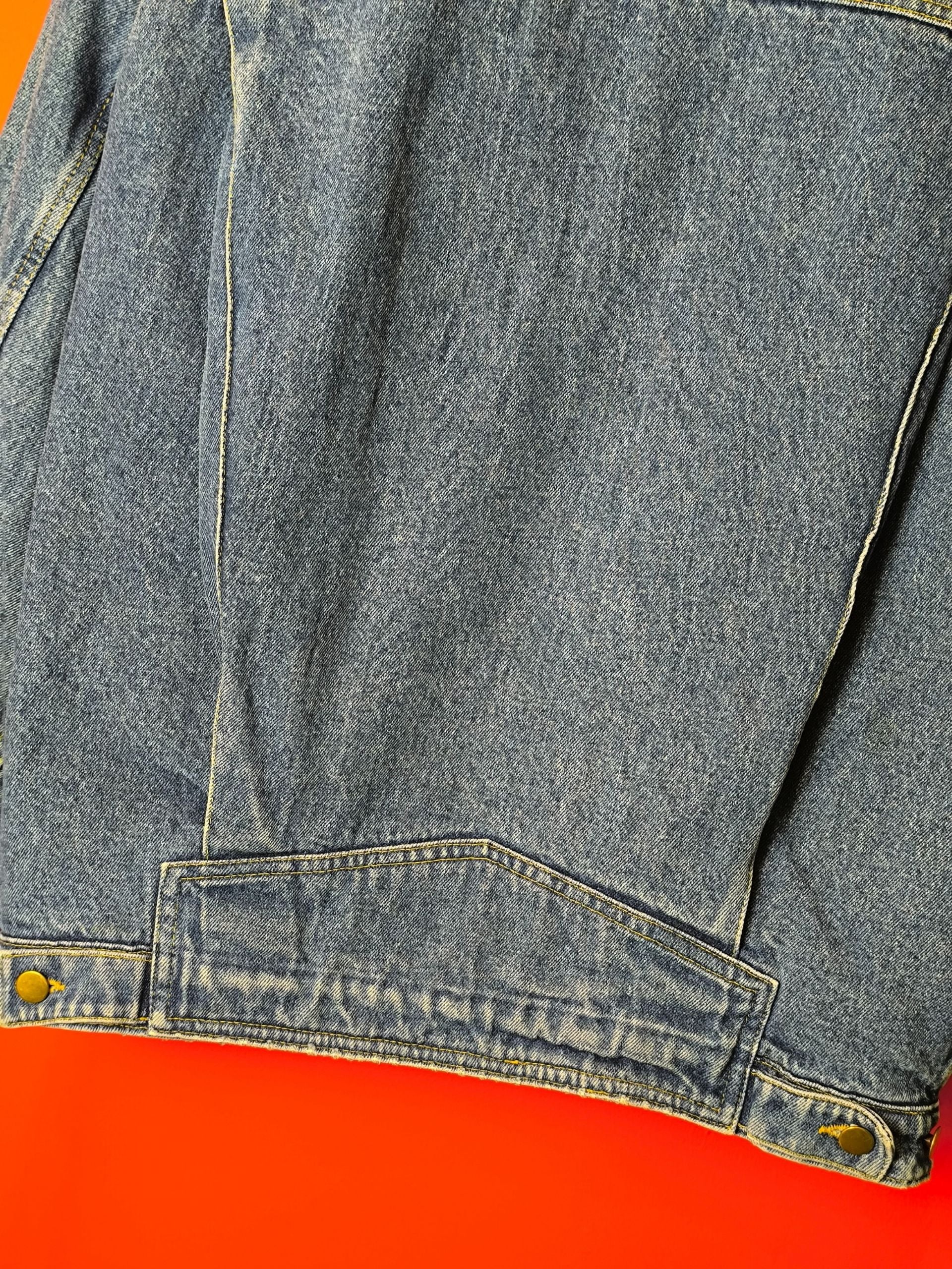 Vintage sherpa τζάκετ από τη Perplex Try by Lucky Star, σε κλασική mid-blue απόχρωση με ζεστή, αφράτη sherpa επένδυση σε όλο το σώμα. Διαθέτει άνετη, ελαφρώς oversized trucker γραμμή, τσέπες με καπάκι στο στήθος, πλαϊνές τσέπες και μεταλλικά κουμπιά σε brass απόχρωση. Το βαμβακερό denim έχει αποκτήσει φυσικά «σπασίματα» και πατίνα από τον χρόνο.