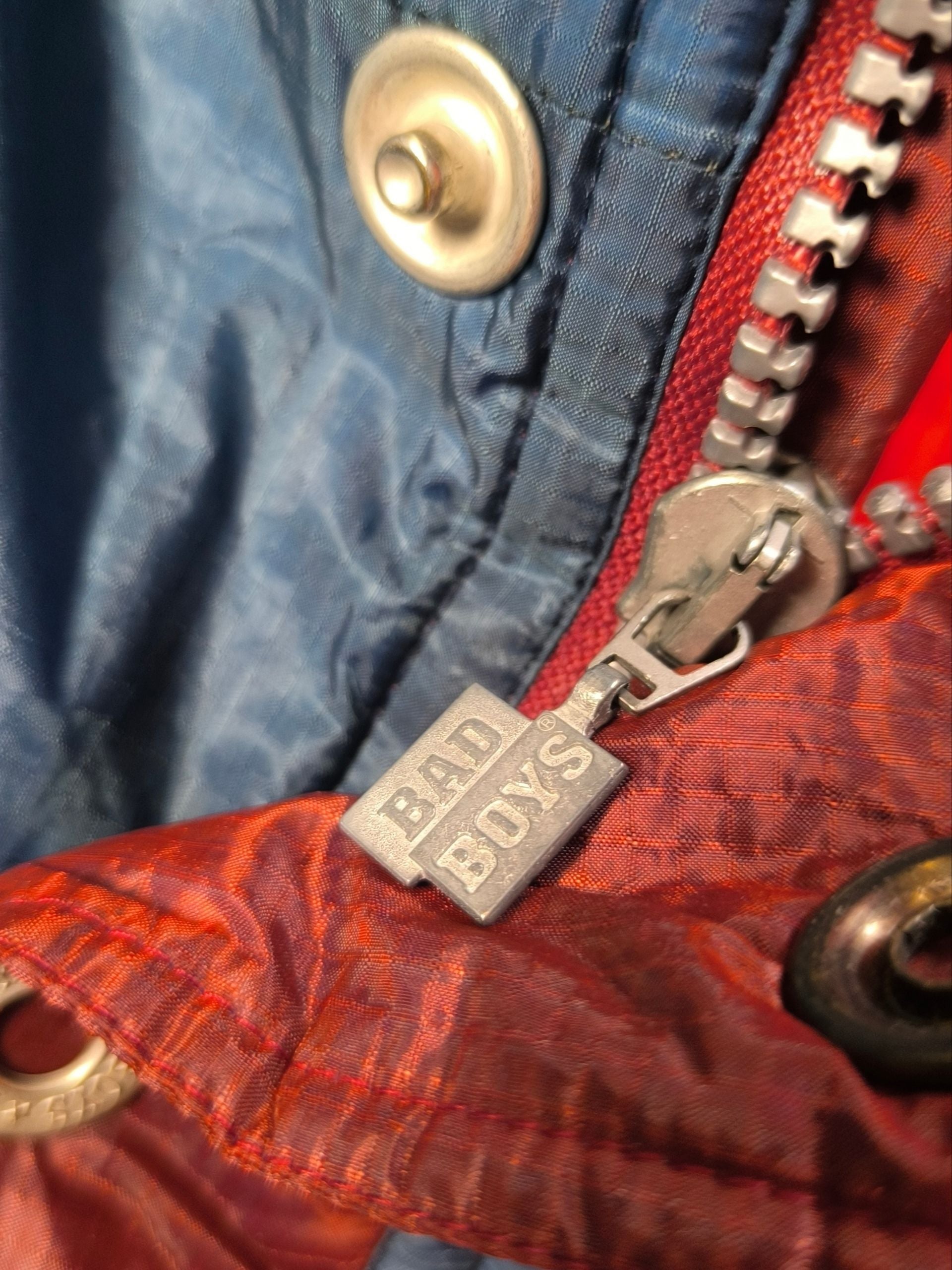 Vintage Bad Boys® windbreaker anorak, a bold late-80s to early-90s streetwear piece in color-block navy and burgundy. Made from lightweight ripstop nylon with a subtle sheen and that unmistakable retro swish texture. Features a half-zip closure with large metal zip pull engraved “BAD BOYS”, branded snap buttons, elasticated cuffs and hem, and multiple zip pockets including a large front pouch. Embroidered Bad Boys logos on the chest and sleeve add a statement touch — pure vintage street energy.