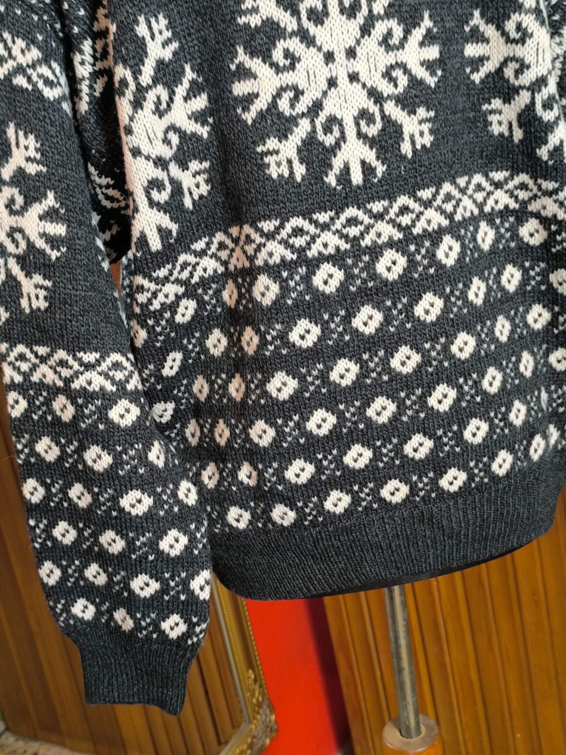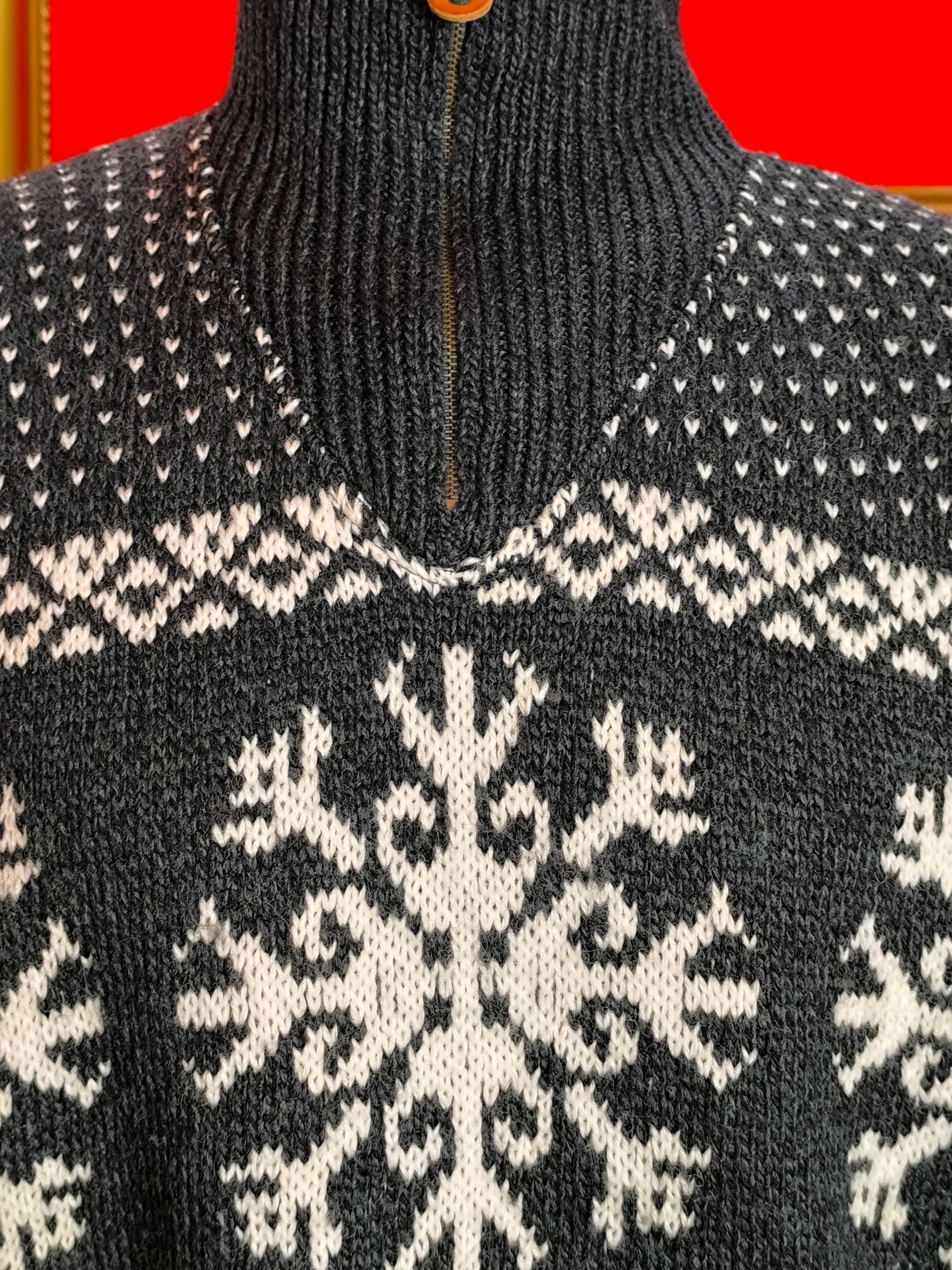A cozy vintage half-zip sweater by Berto Lucci Creazione, featuring a striking Nordic snowflake pattern in black and white. The high ribbed collar with a leather zip pull adds a rustic touch, perfect for winter days or mountain getaways. Made from a soft wool blend, this piece combines warmth, comfort, and timeless alpine style.