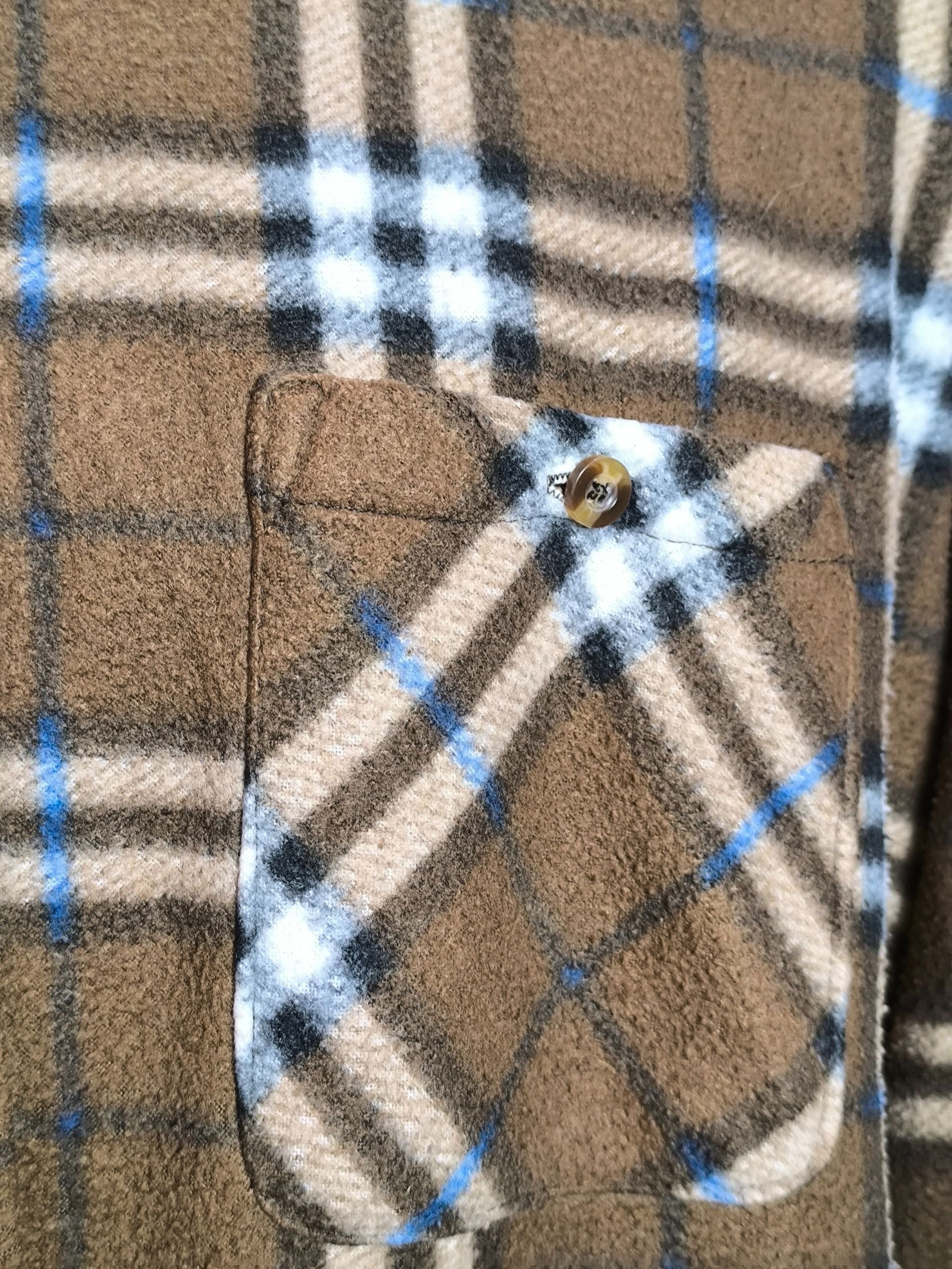 Cozy vintage fleece shirt by Free Jay, featuring a classic brown check pattern with white, beige and subtle blue lines. Made from soft 100% polyester fleece, this shirt combines warmth and style — perfect for layering over a t-shirt or under a jacket during cooler days. Button-down front, buttoned cuffs and a single chest pocket complete its timeless casual look.
