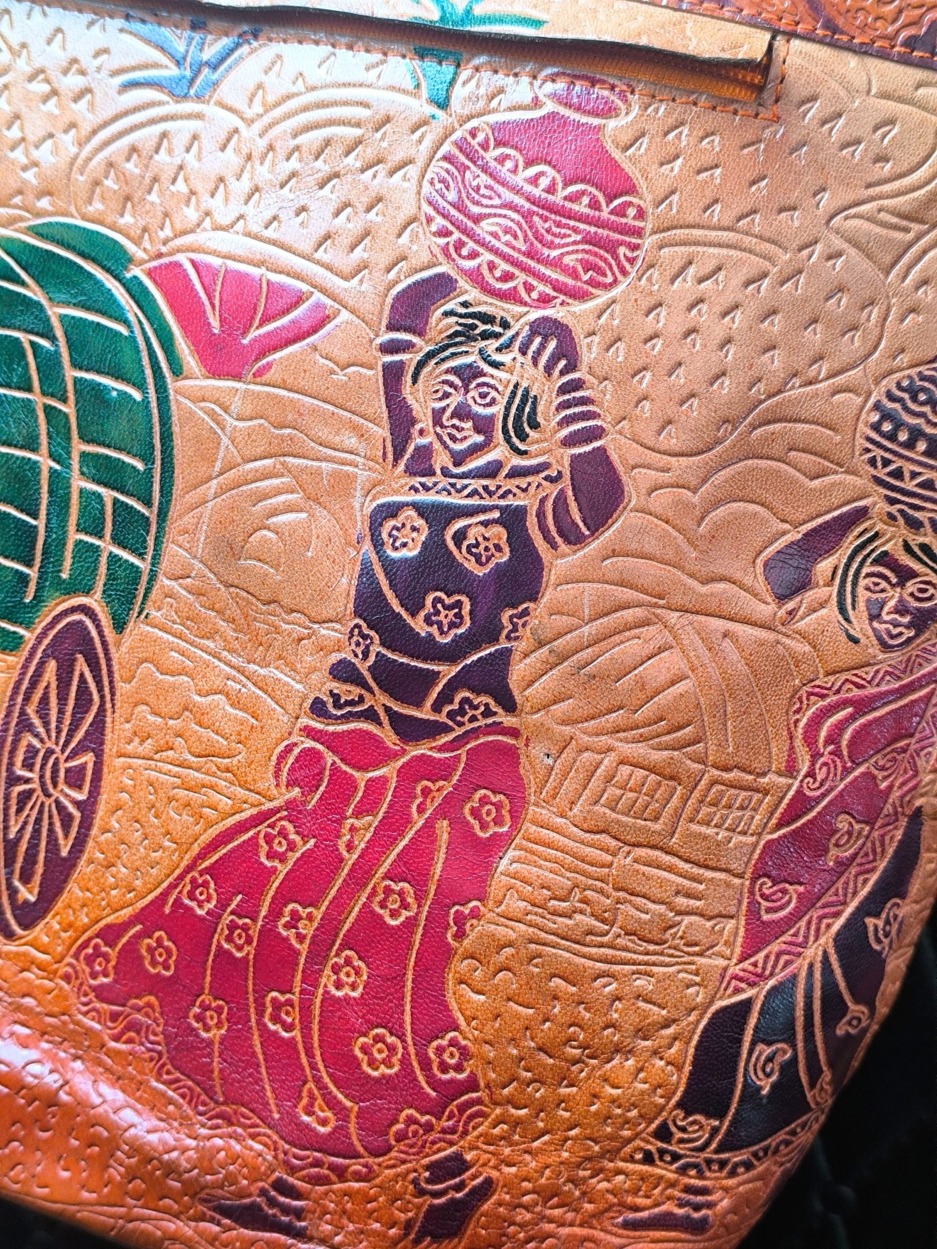 Step into a world of artistry with this vintage embossed leather tote bag, showcasing a vivid hand-tooled design inspired by traditional rural life scenes. Each figure and motif is meticulously crafted, creating a story on leather — from women carrying ornate water pots to a bullock cart, all in rich tones of terracotta, magenta, green, and deep violet.
