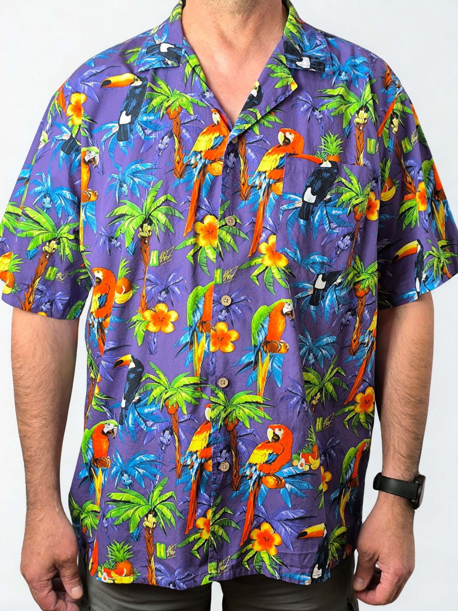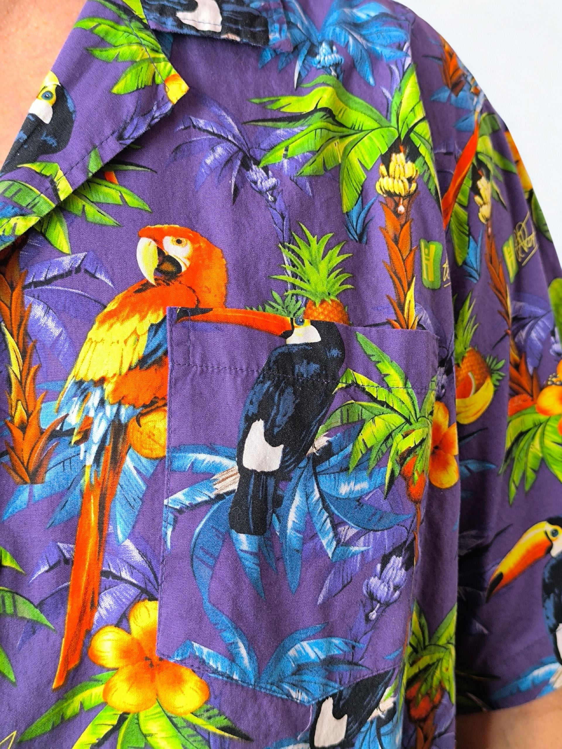 Turn heads with this vibrant vintage Hawaiian shirt from Hawaiihemdshop.de, a German brand known for bold, island-inspired styles. Featuring a lush tropical print with parrots, toucans, and palm trees on a rich purple background, it’s the ultimate summer statement piece. Made from 100% cotton and finished with eco-friendly coconut shell buttons, it offers both comfort and standout style.