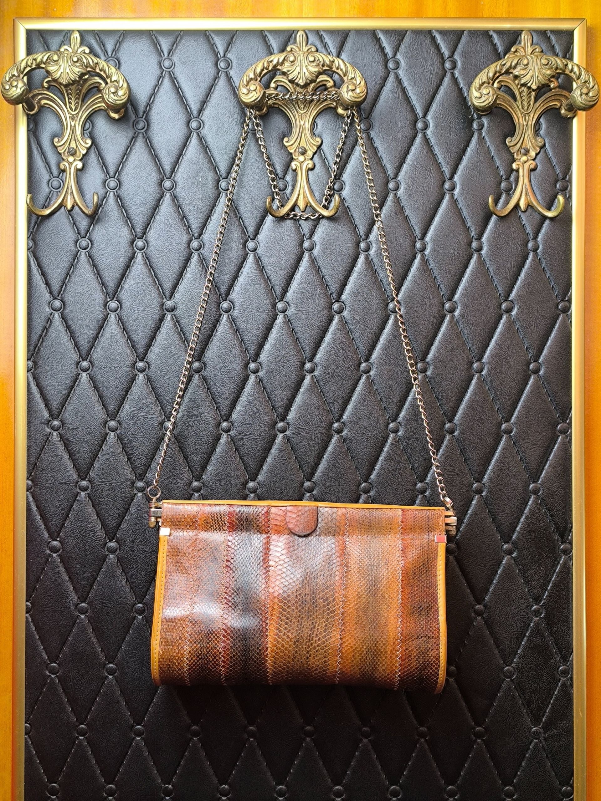 Step into timeless sophistication with this vintage leather shoulder bag, crafted in rich earthy tones with a striking python-style finish. Its sleek envelope silhouette pairs effortlessly with the silver-tone chain and hardware, creating a statement piece that is both elegant and versatile.
