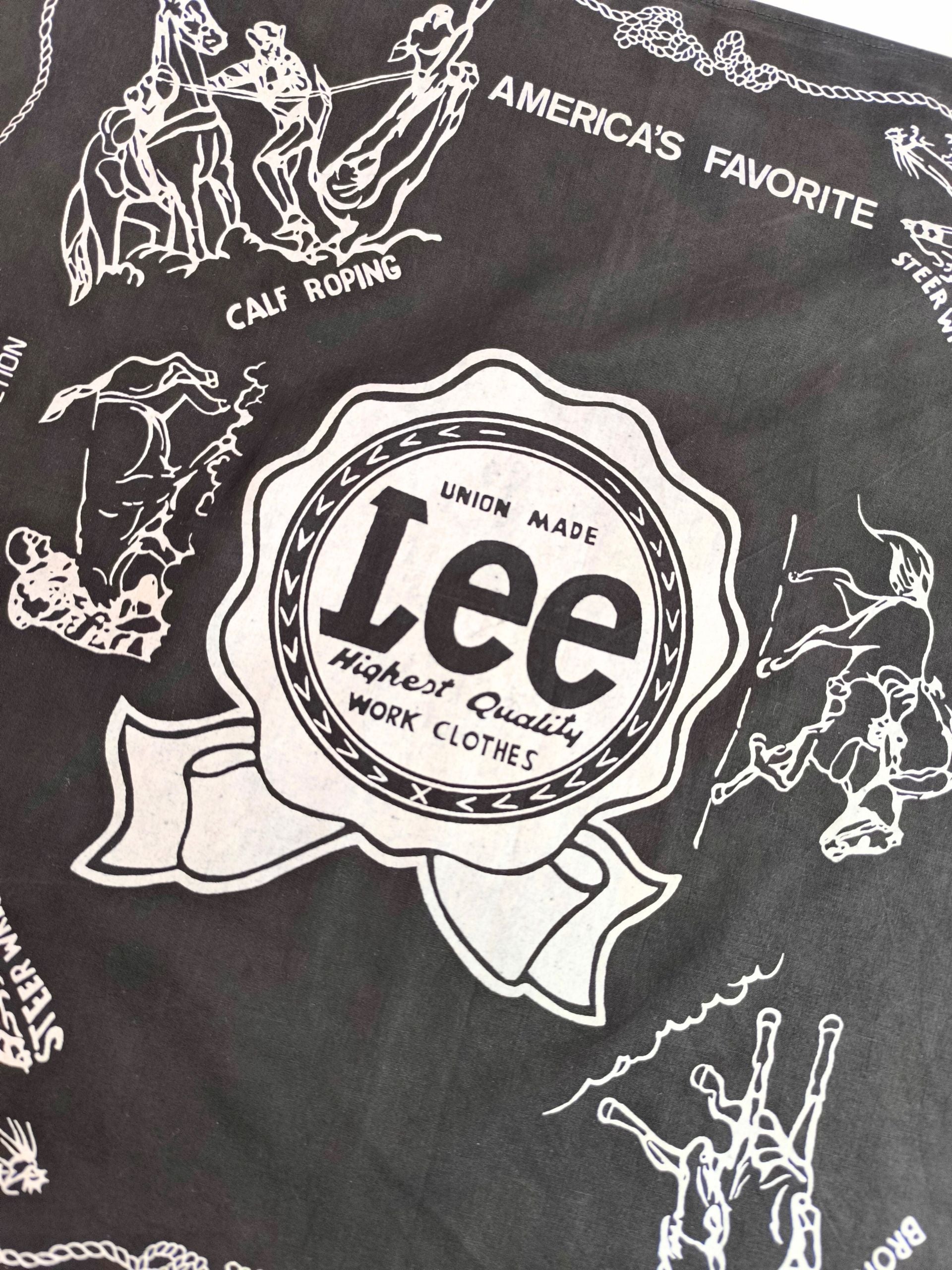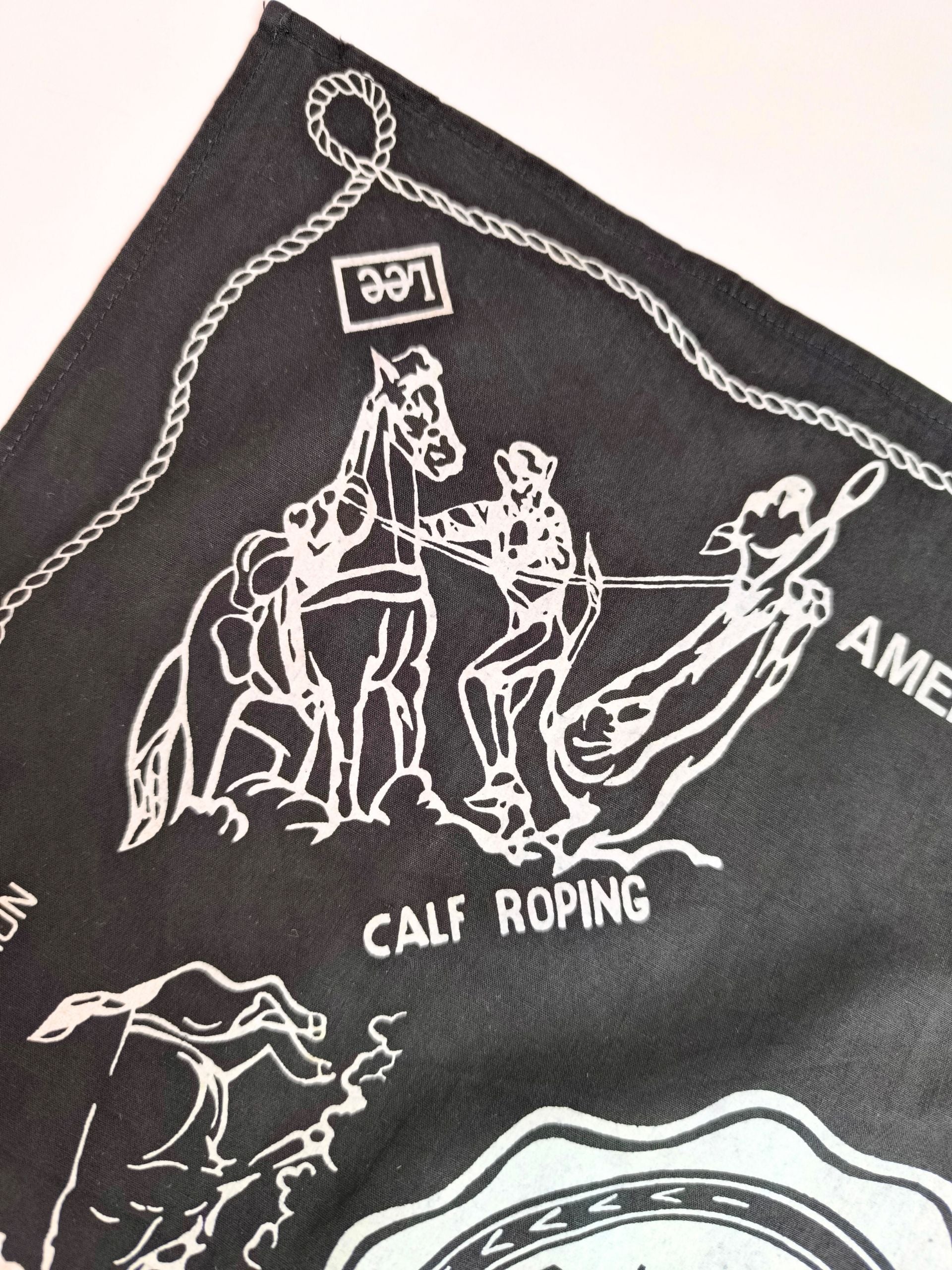 Authentic vintage bandana by the iconic American heritage brand Lee, featuring a striking black background with contrasting white screen-printed illustrations inspired by classic rodeo events like Calf Roping, Steer Wrestling, Bronc Riding, and “Thrilling Explosive Action.” At the center sits the unmistakable “Union Made – Lee – Highest Quality Work Clothes” badge, framed by ribbon and rope-knot motifs that amplify the cowboy aesthetic.