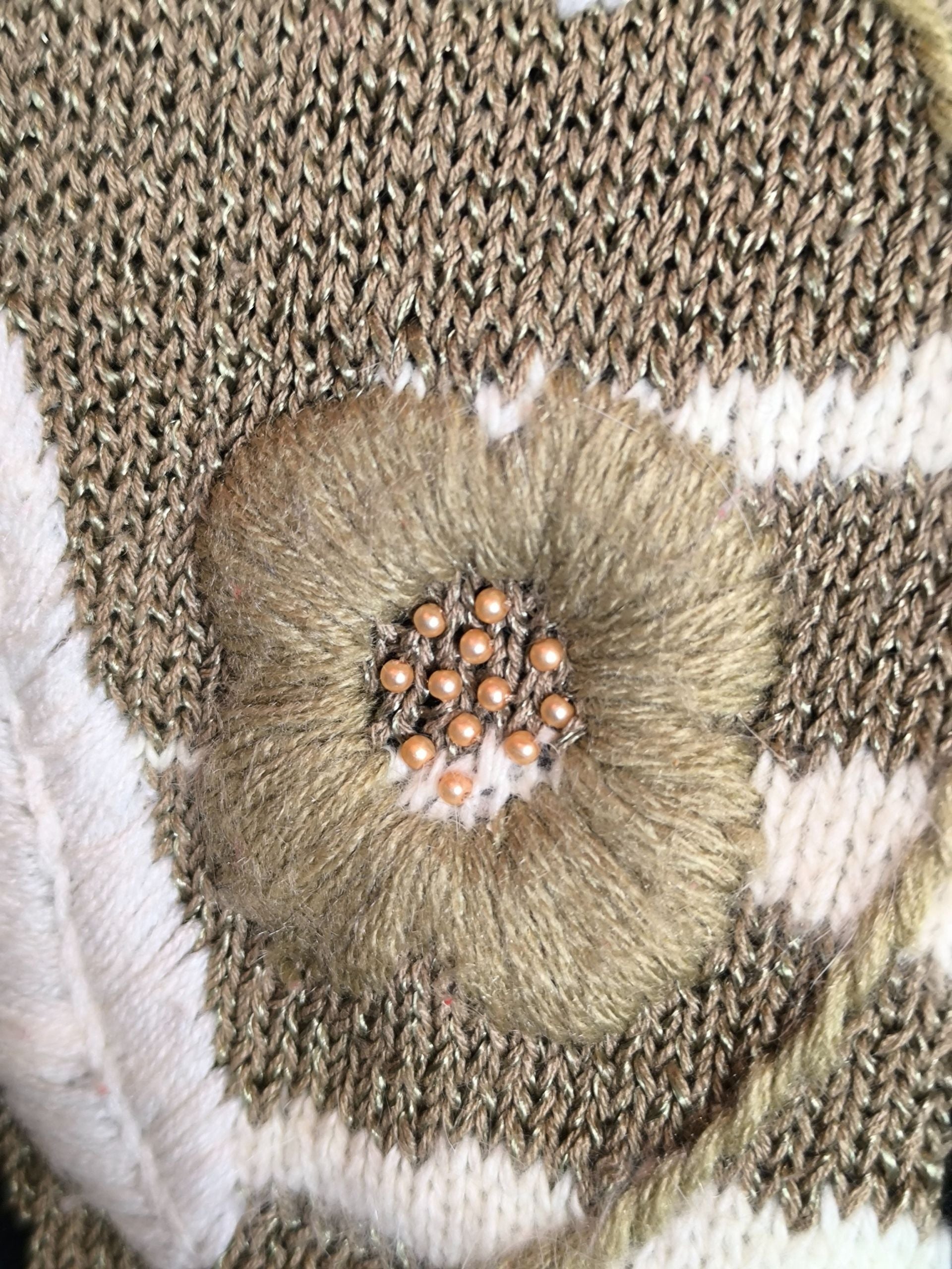 This stunning knit features a textured floral embroidery with beaded flower centers, blending warm earth tones of beige, cream, and black.
