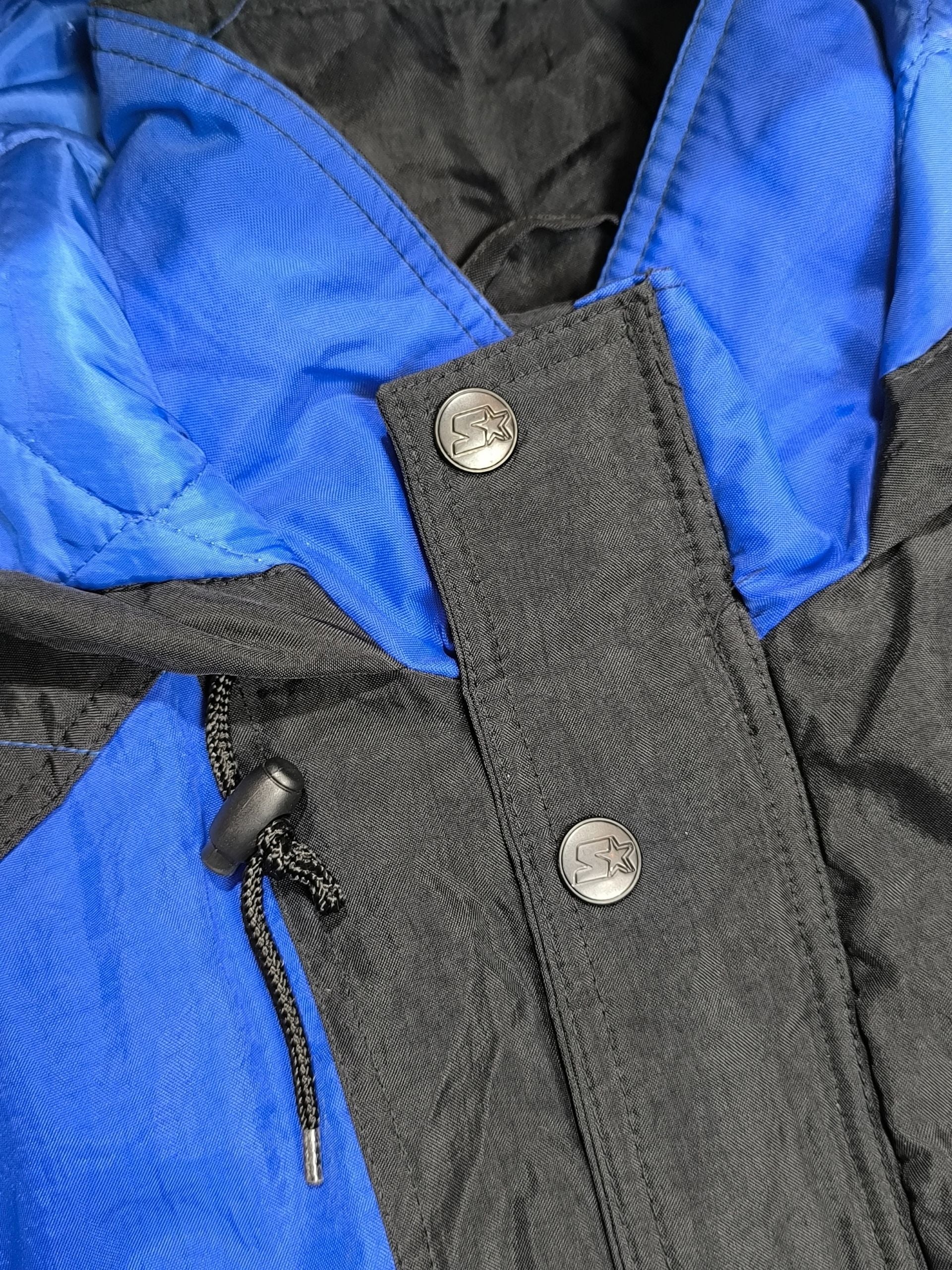 Ιδιαίτερα συλλεκτικό αυθεντικό NBA puffer jacket Starter x Golden State Warriors της δεκαετίας του 1990. Εμβληματικό κομμάτι vintage sportswear, με έντονο χρωματικό μπλοκάρισμα, βαριά καπιτονέ επένδυση, κουκούλα και μεγάλα κεντημένα λογότυπα της ομάδας στο στήθος και στην πλάτη. Κατασκευασμένο στην Κορέα και επίσημα αδειοδοτημένο από το NBA, αποτελεί περιζήτητο κομμάτι για συλλέκτες vintage NBA και Starter παγκοσμίως.
