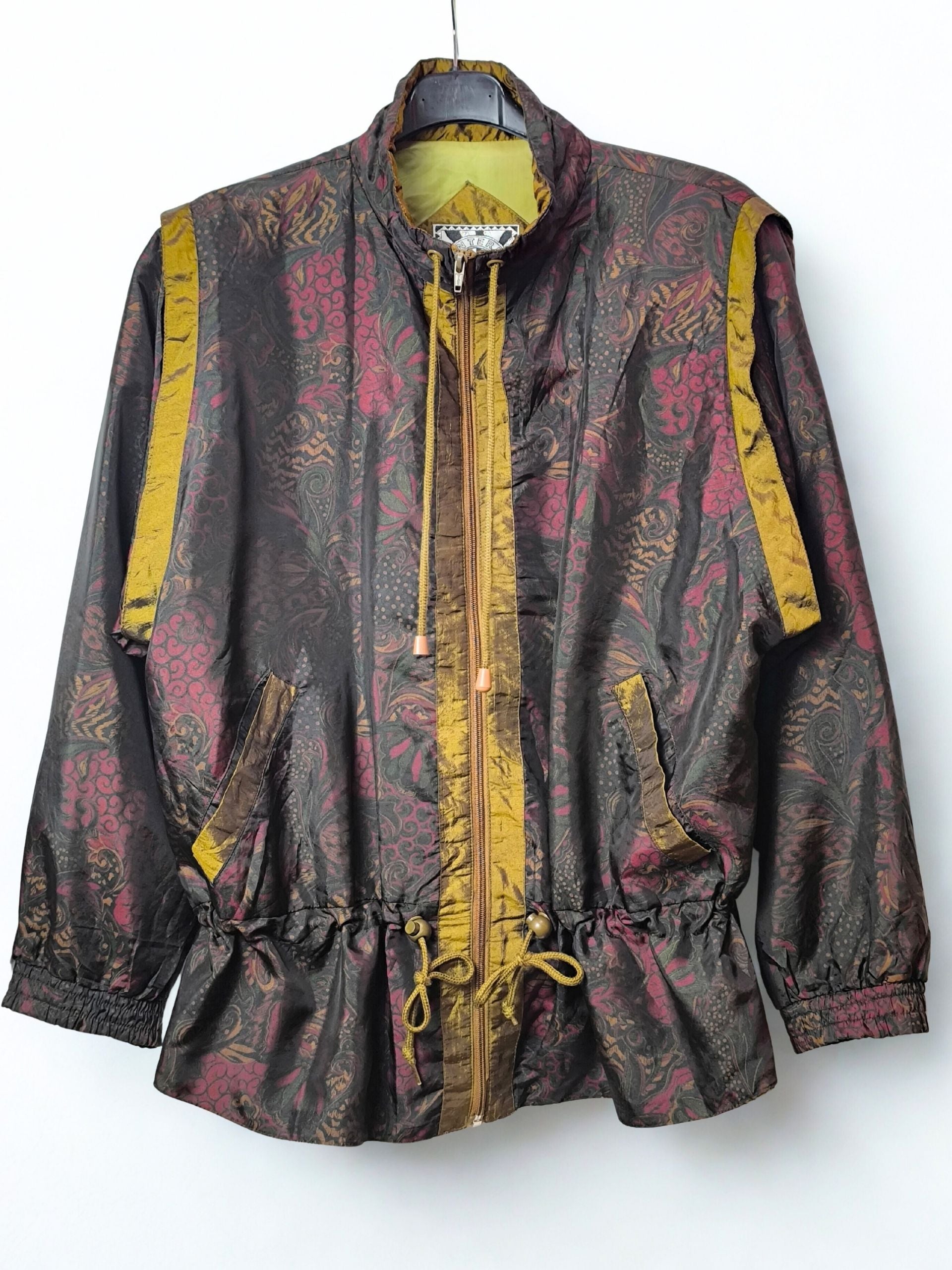 A rare gem from the late '80s to early '90s, this Sunterra Lady windbreaker is an eclectic mix of boho glam and sportswear chic. Featuring a shimmering paisley jacquard print in deep burgundy, olive green, and gold, it’s accented with striking golden-mustard panels — created by flipping the same glossy fabric inside out — on the zip placket, shoulders, and pockets. The silhouette is slightly cinched at the waist with adjustable drawstrings, creating a flattering hourglass shape.