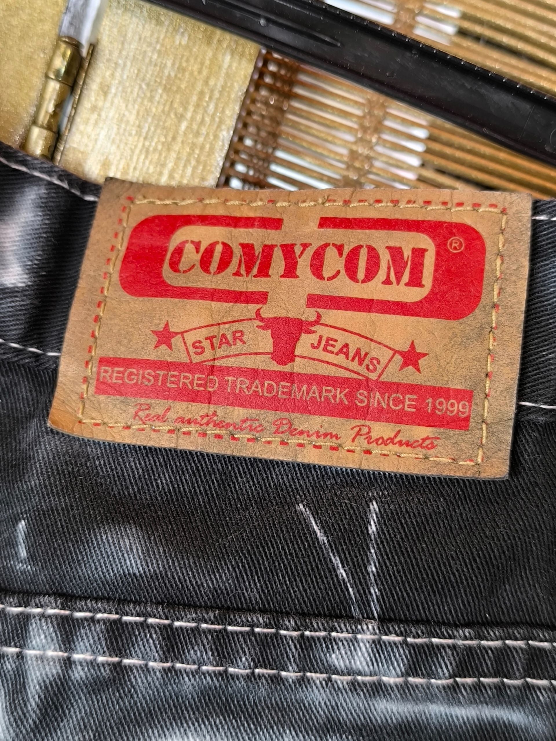 Striking flare jeans by Comycom Star Jeans, featuring a bold black & white tie-dye pattern that perfectly channels the authentic late 90s / early 2000s Y2K aesthetic. Crafted from 100% cotton premium denim (non-stretch), this piece showcases signature brand details: