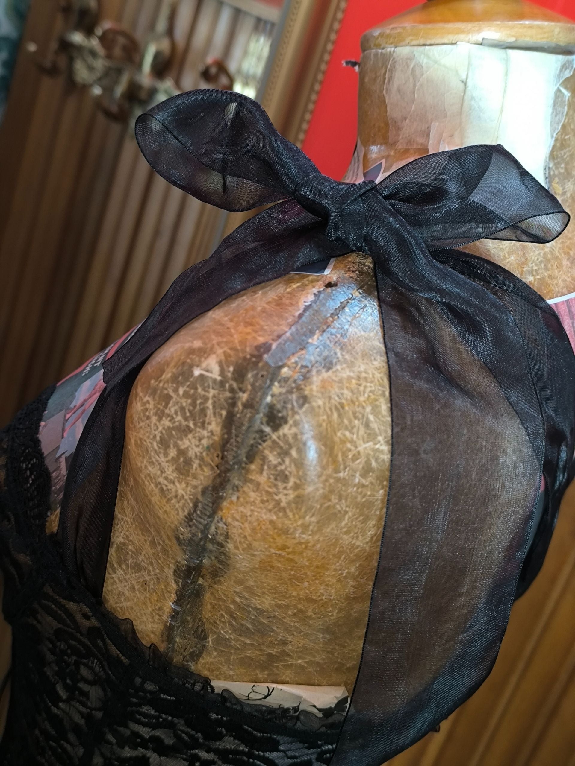 Ένα ρομαντικό μαύρο δαντελένιο κορσέ top με διάφανη φλοράλ δαντέλα, απαλά βολάν και σατέν κορδέλες. Το μπροστινό μέρος δένει με κορδόνια, ενώ οι φαρδιές κορδέλες από οργάντζα δένονται σε φιόγκους στους ώμους και σταυρώνουν εντυπωσιακά στην πλάτη.