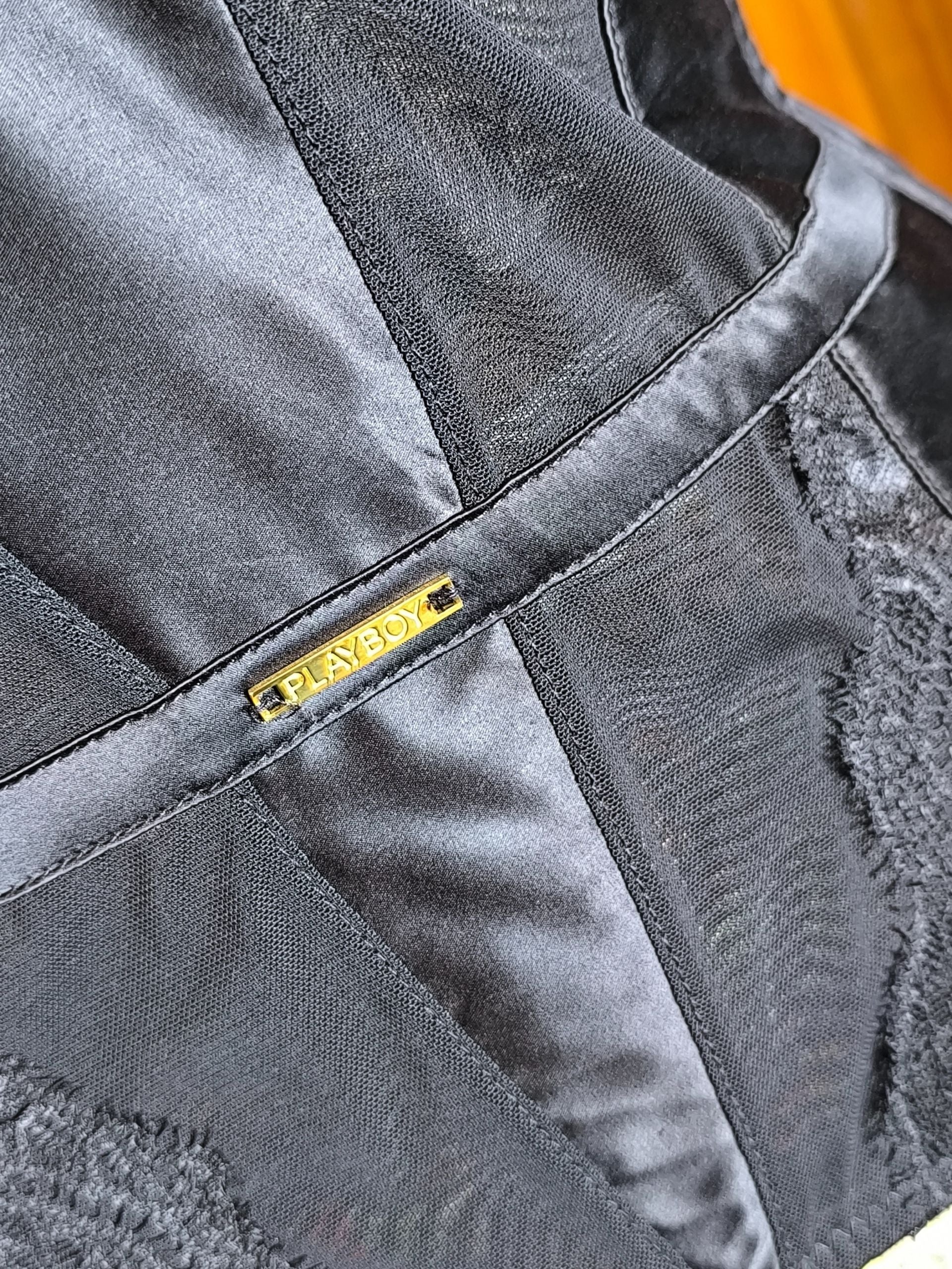 A striking Playboy black corset, designed in Australia, combining smooth satin with delicate lace details. Structured cups, adjustable straps, and boned sides sculpt the body beautifully, while the gold Playboy plaque adds a touch of signature glamour. The back features hook-and-eye fastening and sheer mesh panels for a flattering fit. An iconic piece that channels the Playboy sensual aesthetic of the 2000s.