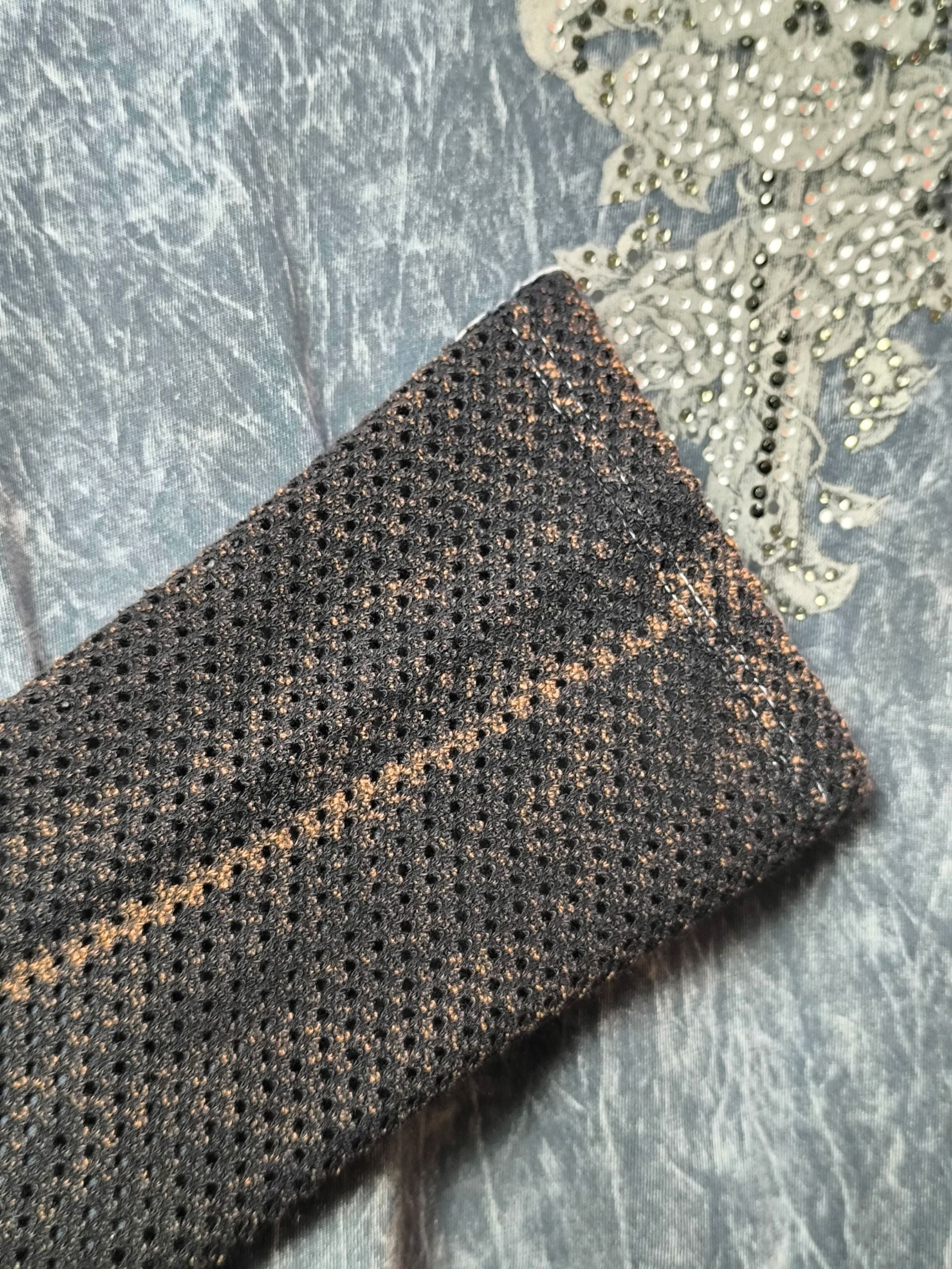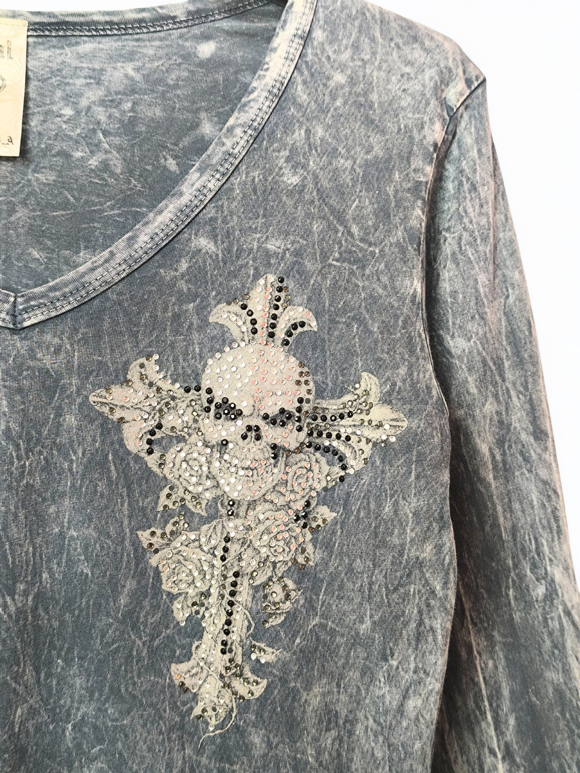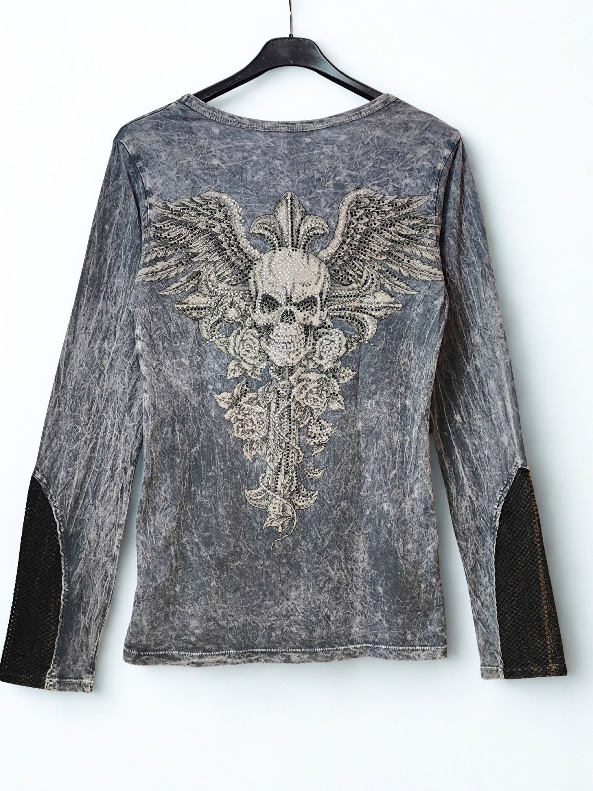 Straight from the late 2000s Y2K glam era, this Vocal long-sleeve top is a total showstopper. Made in the USA, it features a washed grey finish with a rhinestone skull and rose design on both front and back, giving off gothic-rock vibes. Black mesh inserts on the sleeves add that extra edge.